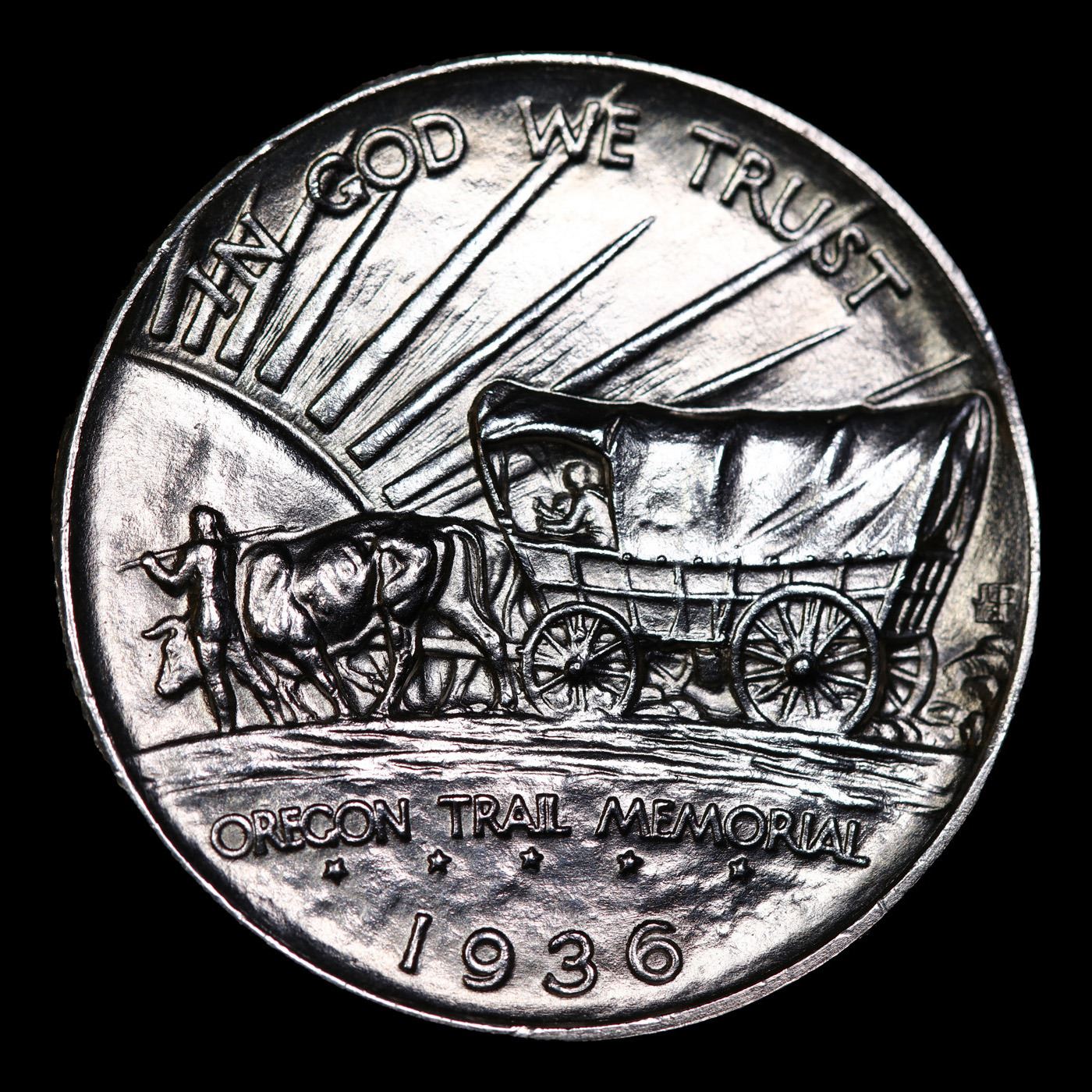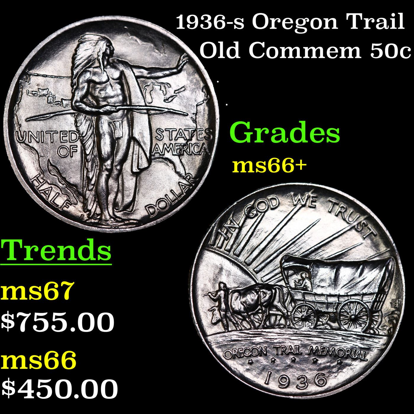 1936-s Oregon Trail Old Commem Half Dollar 50c Grades GEM++ Unc. One of the most beautifully designed coins in American History, Designed by the same engraver that designed the Buffalo Nickel, This coin Commemorates the Oregon Trail that brought thousands of Intrepid pioneers to the West in the 1830's and 40's. When Buying an Oregon Trail Commemorative, regardless of year and mint the Points to first show wear are the Indian’s hand and thigh on the obverse and the ox and the bows of the wagon’s cover on the reverse, these are the high points. The 1936-S is the fourth lowest mintage of the 14 Oregon Trail commemorative half dollars and it is indeed the fourth rarest in total number of survivors, surpassed in rarity only by the three very low mintage 1939 issues. There were 5006 originally minted and the issue price was $1.60 per coin. The 1936-S had good initial collector demand and in the summer of 1936 they were bringing as much as $5.50 in various dealer offerings.The 1936-S, like all Oregon's, comes very nice. The surfaces are normally very clean and the luster is usually frosty and excellent. The typical grade is MS64 to MS66. This issue is virtually unknown in circulated grades as the entire issue was saved.