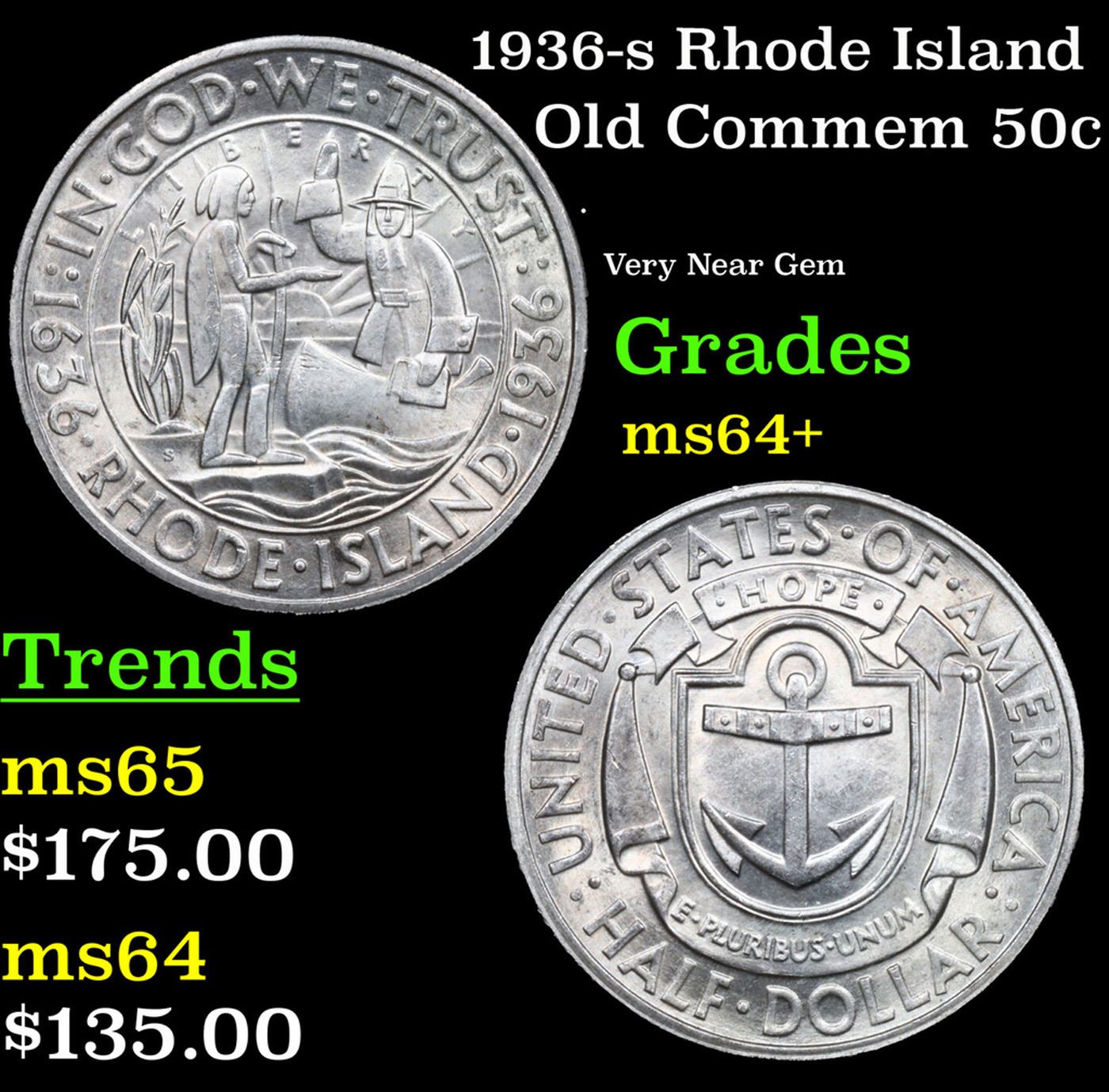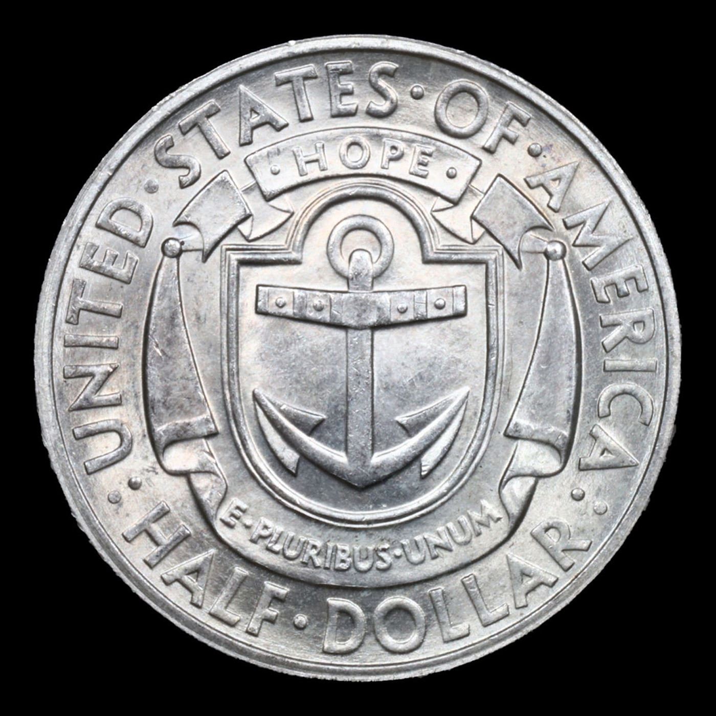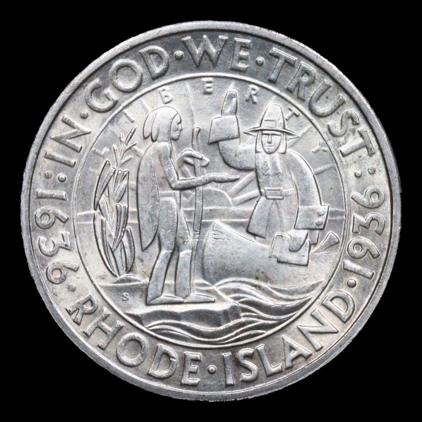 1936-s Rhode Island Old Commem Half Dollar 50c Grades Choice+ Unc. The commemorative coin most commonly referred to as the 1936 Rhode Island Tercentenary Half Dollar (Buy on eBay) was actually issued to mark the 300th anniversary of the founding of Providence by Roger Williams. The maximum authorized mintage was 50,000 pieces, of which the entire amount was produced across three mint facilities and distributed to the public.Designs for the coins were created by John Howard Benson and Arthur Graham Carey. Their original models did include reference to the Providence with inscriptions around the outer edge of the coin on the obverse “In a scene of God’s Merciful providence until me, called the place Providence” and on the reverse “State of Rhode Island and Providence Plantation Tercentenary”. These lengthy inscriptions were not used in the final version of the design.The obverse features a scene of John Williams in a canoe, holding a bible, and greeting a Native American who stands on the shore extending a hand. The “sun of religious liberty” appears in the background. The reverse design features an anchor and shield motif, adopted from the Rhode Island state seal. These designs were struck in low relief, but with sharply designed elements that resemble a woodcut.Including pieces struck for assay, the Philadelphia Mint produced 20,013, the Denver Mint 15,010, and the San Francisco Mint 15,011. The Rhode Island Half Dollars were issued for $1 each and said to have sold out quickly, however it was later suspected that some insiders held back portions of their allotments in order to sell them to the public at higher prices after the so-called sell out.Due to the nature of the design, contact marks may be prominent on the obverse and reverse. A small number of the coins are found with proof like surfaces, and these pieces command a premium.