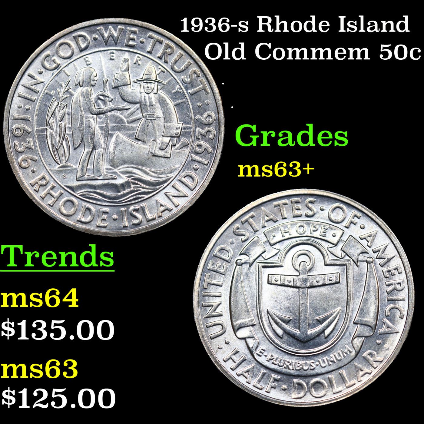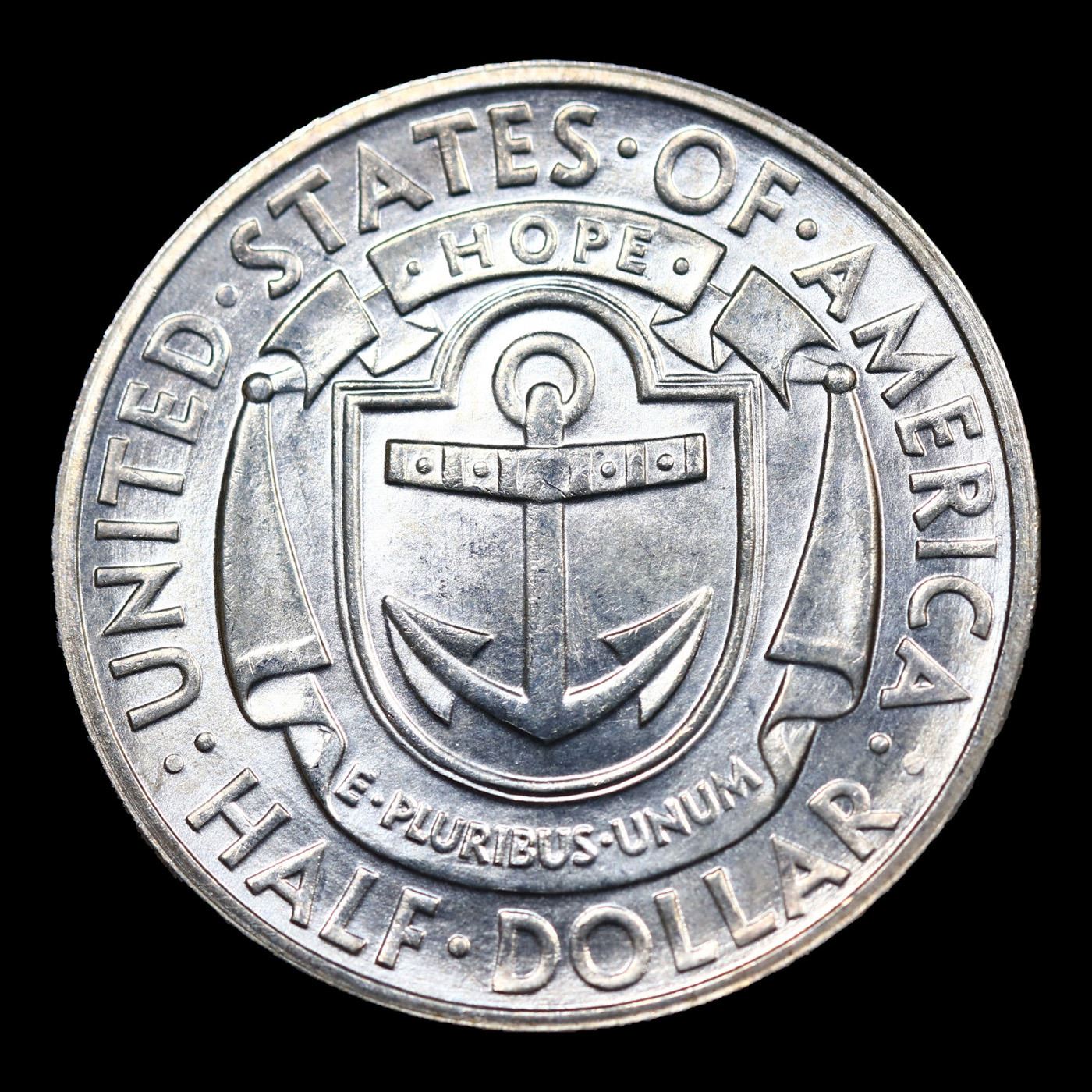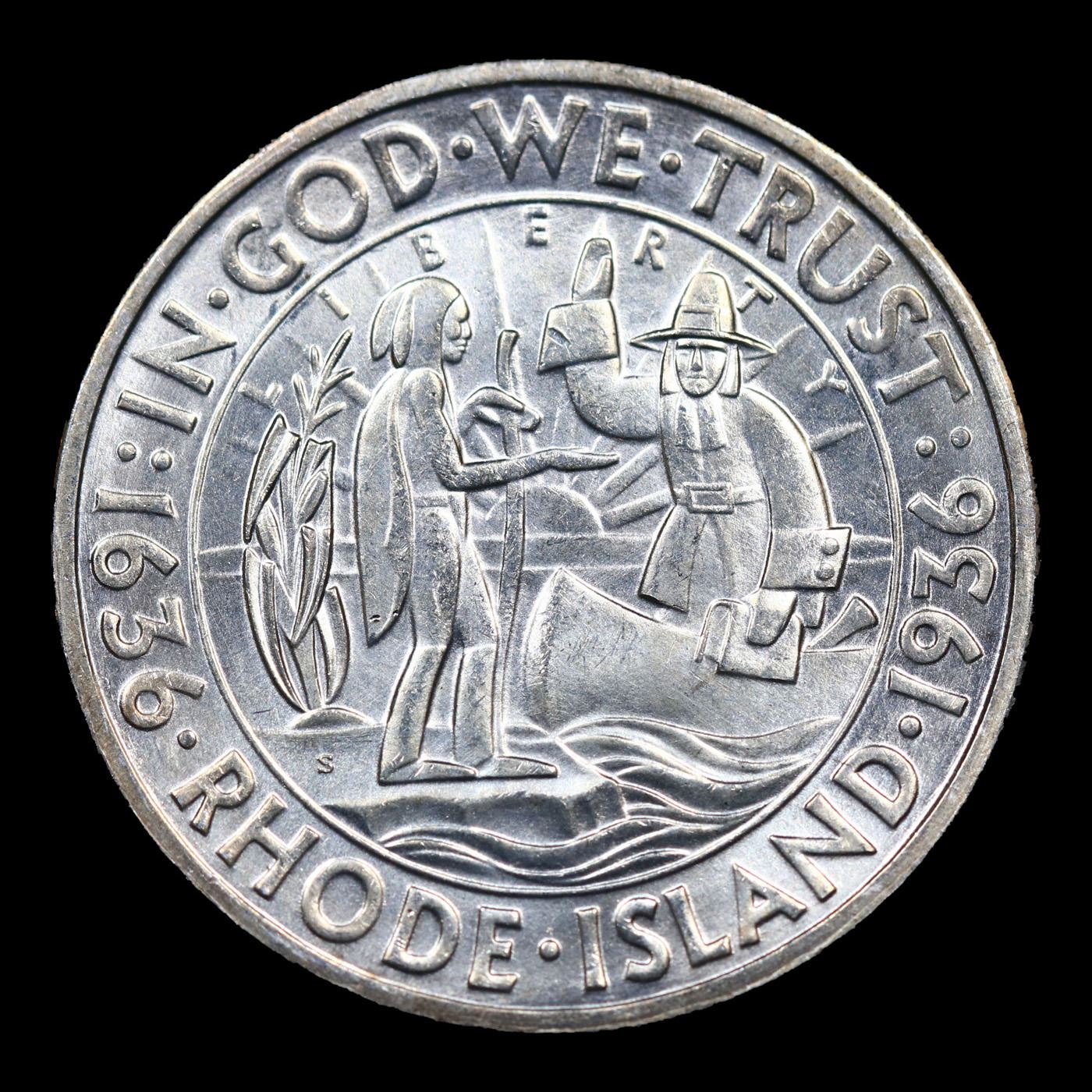1936-s Rhode Island Old Commem Half Dollar 50c Grades Select+ Unc. The commemorative coin most commonly referred to as the 1936 Rhode Island Tercentenary Half Dollar (Buy on eBay) was actually issued to mark the 300th anniversary of the founding of Providence by Roger Williams. The maximum authorized mintage was 50,000 pieces, of which the entire amount was produced across three mint facilities and distributed to the public.Designs for the coins were created by John Howard Benson and Arthur Graham Carey. Their original models did include reference to the Providence with inscriptions around the outer edge of the coin on the obverse “In a scene of God’s Merciful providence until me, called the place Providence” and on the reverse “State of Rhode Island and Providence Plantation Tercentenary”. These lengthy inscriptions were not used in the final version of the design.The obverse features a scene of John Williams in a canoe, holding a bible, and greeting a Native American who stands on the shore extending a hand. The “sun of religious liberty” appears in the background. The reverse design features an anchor and shield motif, adopted from the Rhode Island state seal. These designs were struck in low relief, but with sharply designed elements that resemble a woodcut.Including pieces struck for assay, the Philadelphia Mint produced 20,013, the Denver Mint 15,010, and the San Francisco Mint 15,011. The Rhode Island Half Dollars were issued for $1 each and said to have sold out quickly, however it was later suspected that some insiders held back portions of their allotments in order to sell them to the public at higher prices after the so-called sell out.Due to the nature of the design, contact marks may be prominent on the obverse and reverse. A small number of the coins are found with proof like surfaces, and these pieces command a premium.