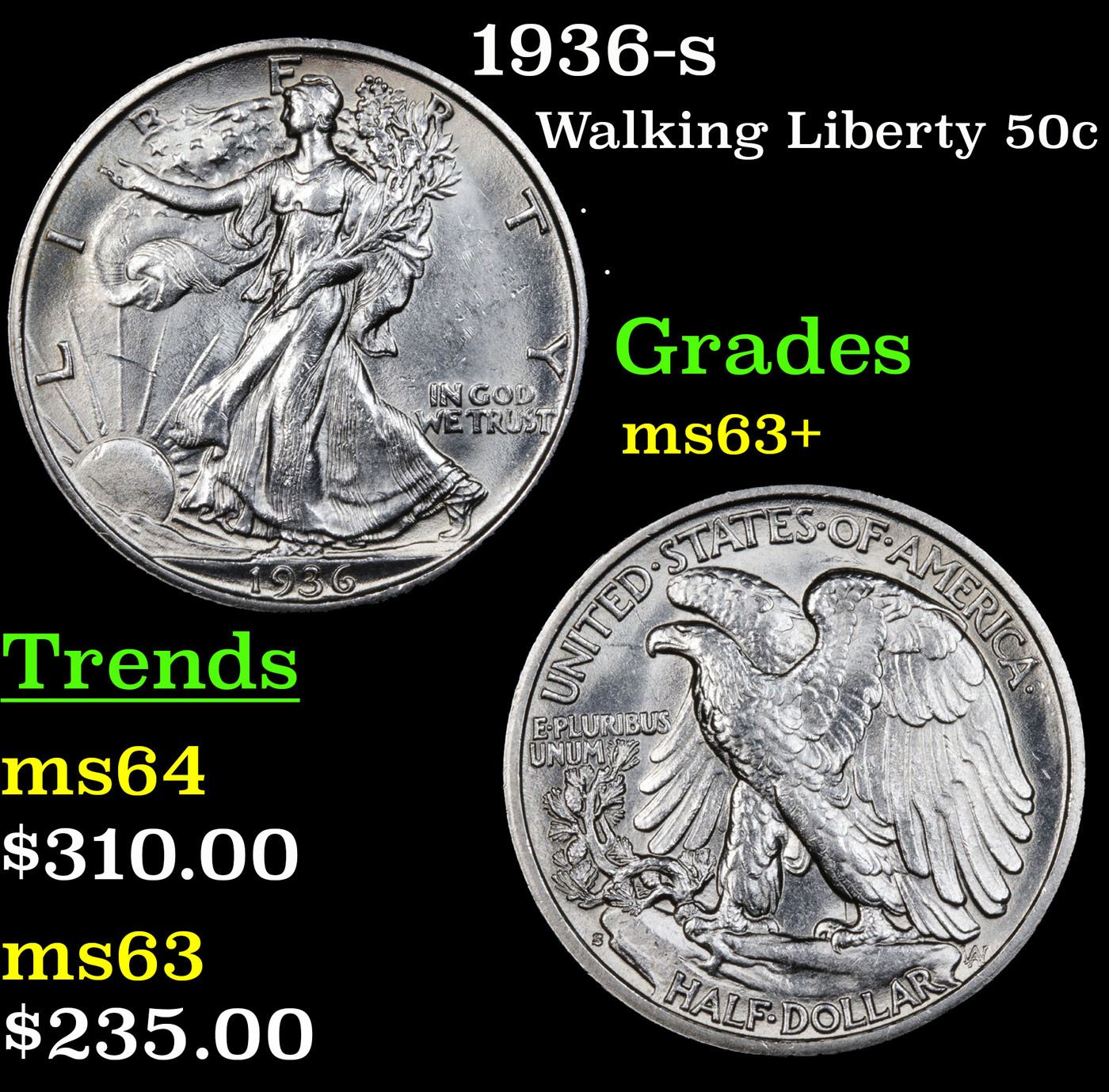 1936-s Walking Liberty Half Dollar 50c Grades Select+ Unc.