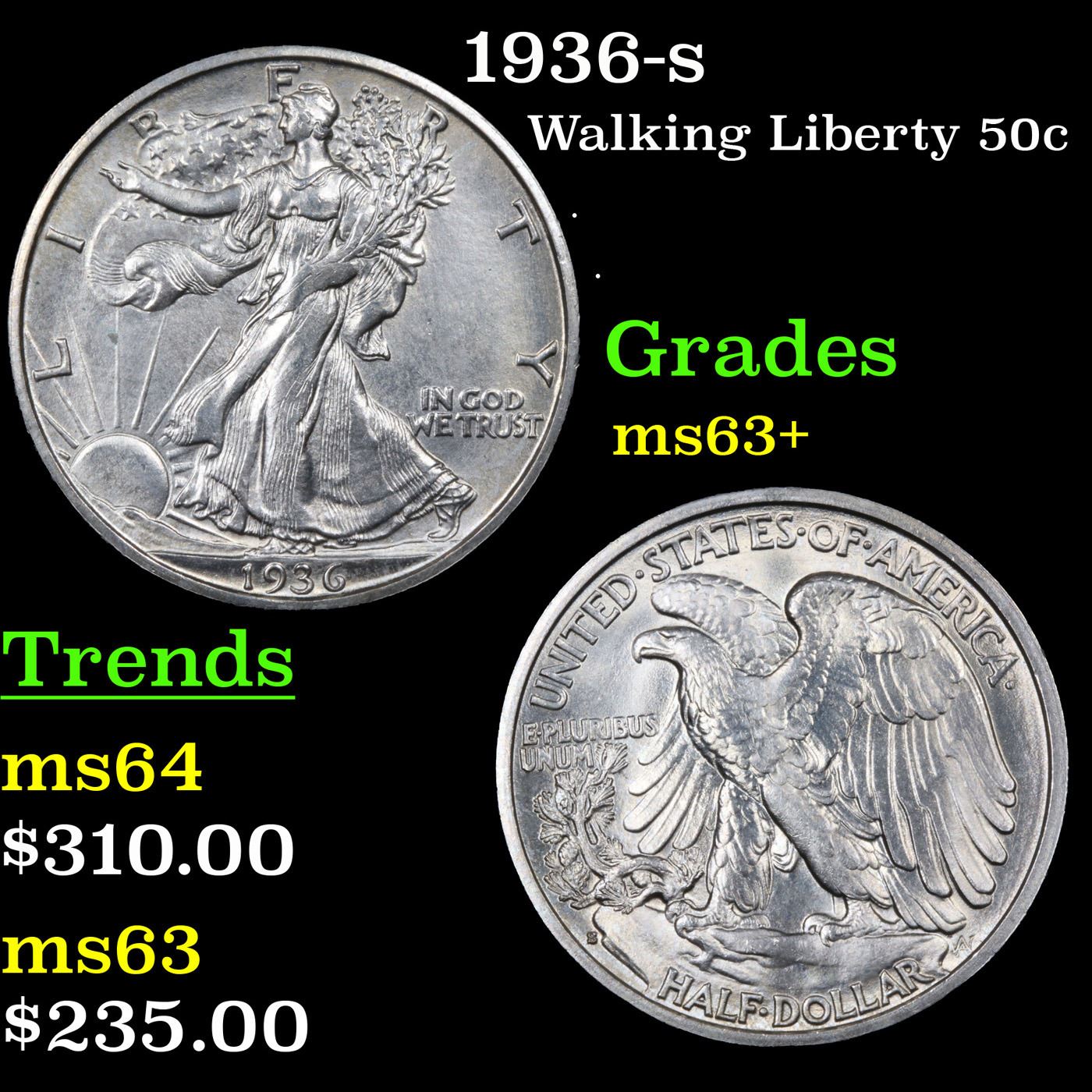 1936-s Walking Liberty Half Dollar 50c Grades Select+ Unc.