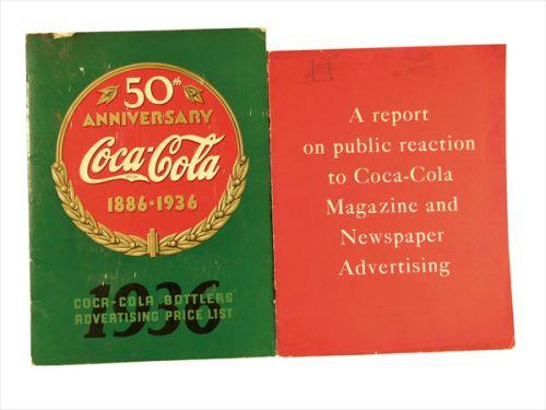 Coca Cola Bottlers Price List 1936, 50th Anniversary Edition. Report on public reaction to Coca Cola newspaper and magazine advertising. Good condition. 11 X 15 inches.