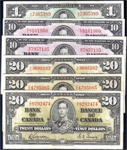 1937 One Dollar Coyne-Towers BC-21d, Ten Dollars Coyne-Towers BC-24b, Ten Dollars Coyne-Towers BC-24c, Twenty Dollars Gordon-Towers, BC-25b two notes and Twenty Dollars Coyne-Towers BC-25c. Total six notes, grading from VF to EF