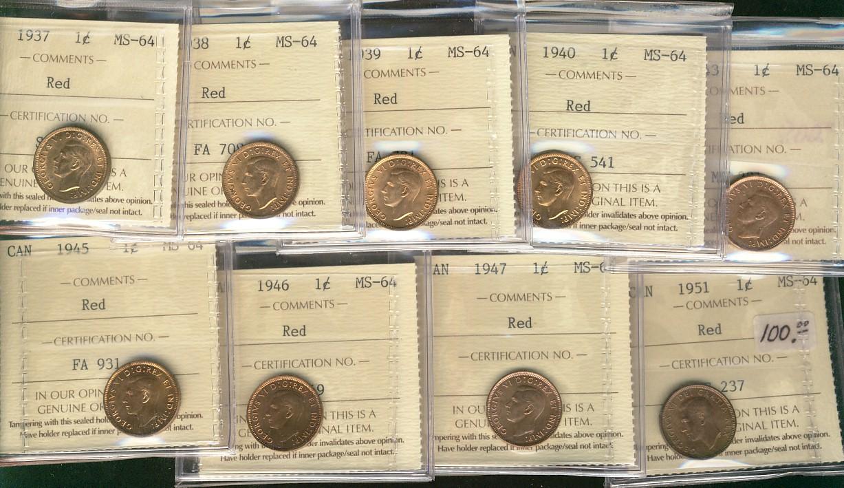 1937 1¢, 1938, 1939, 1940, 1943, 1945, 1946, 1947 & 1951 ICCS MS64RD. Lot of 9 coins.