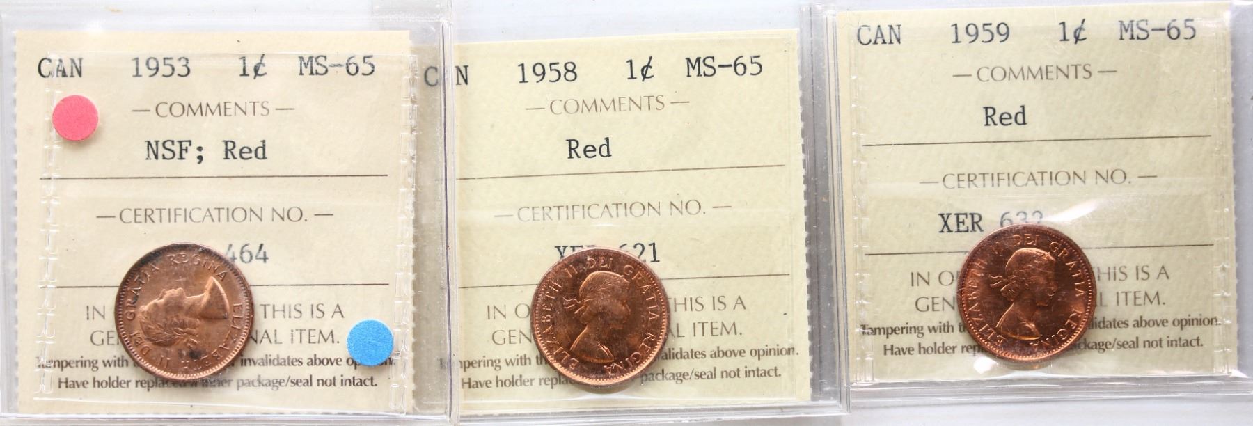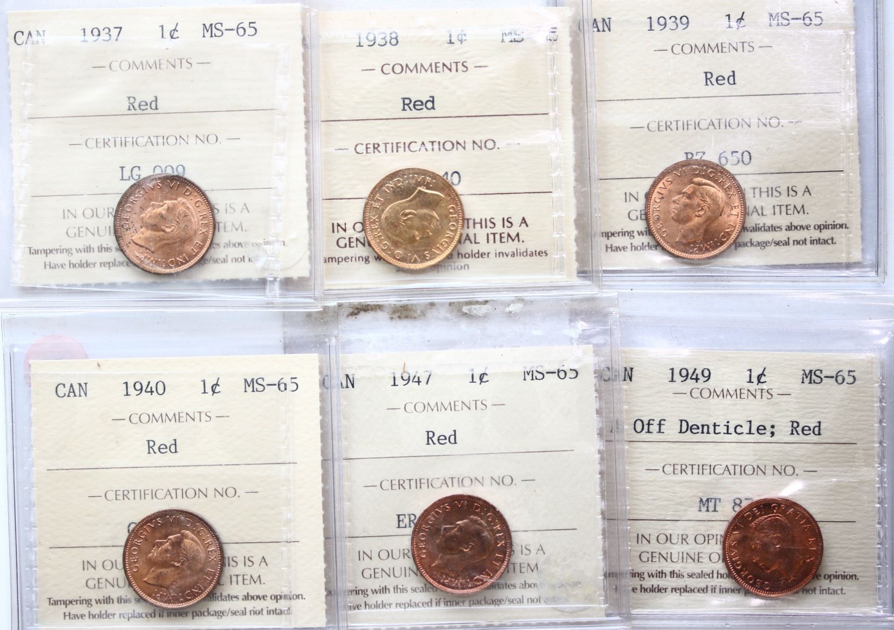 1937 1¢ , 1938, 1939, 1940, 1947, 1949 A off, 1953 NSF, 1958, 1959, All 9 coins ICCS Gem Mint State-65 Red.