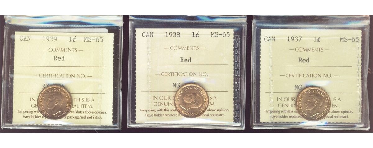 1937 1¢, 1938 & 1939 ICCS MS65RD. Lot of 3 coins.