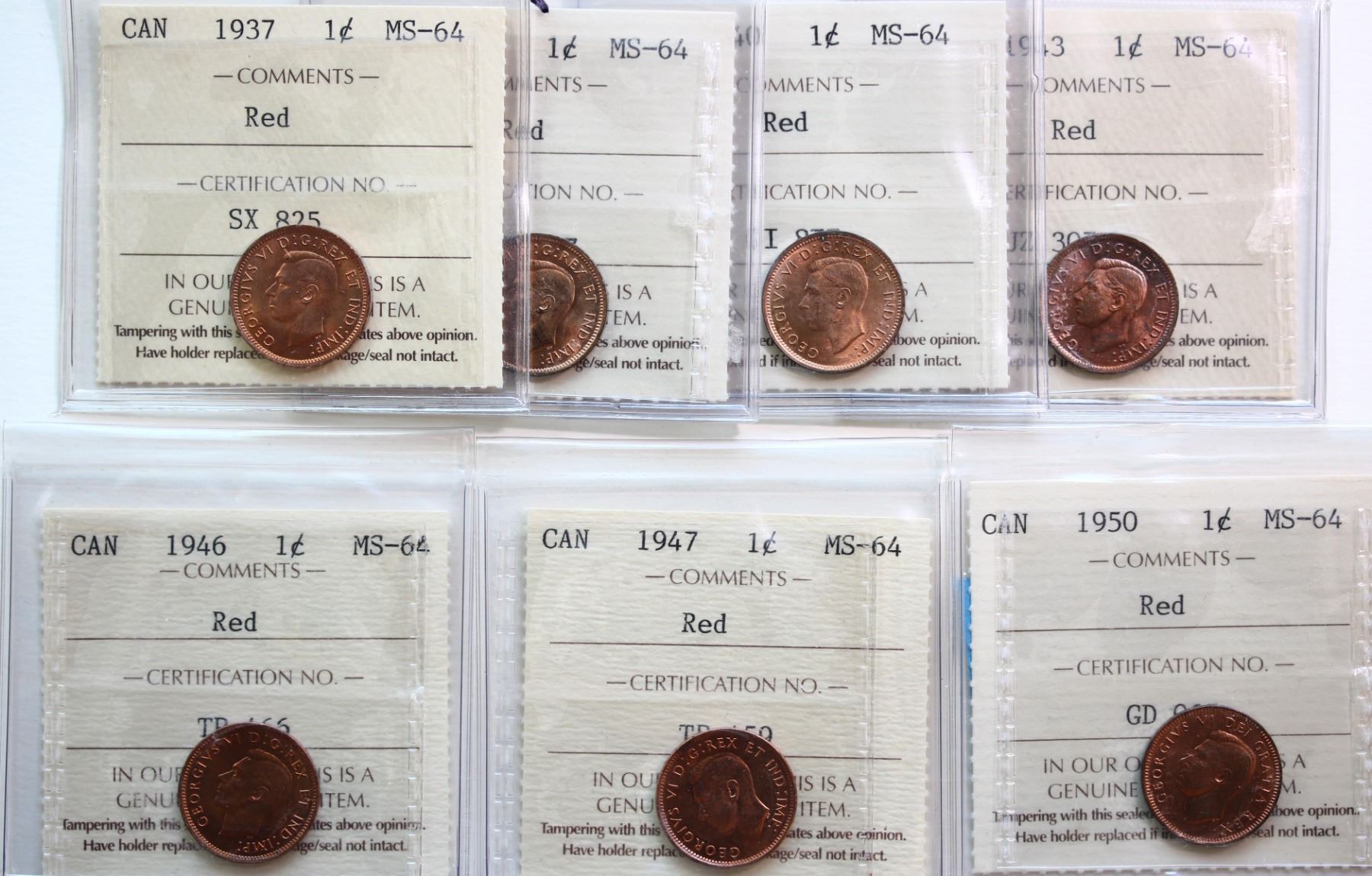 1937 1¢, 1938, 1940, 1943, 1946, 1947, 1950. Lot of 7 coins all ICCS Choice Mint State-64 Red