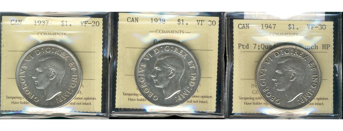 1937 $1, 1938 & 1947 Ptd 7 Quad HP ICCS VF20 to VF30. Lot of 3 coins.