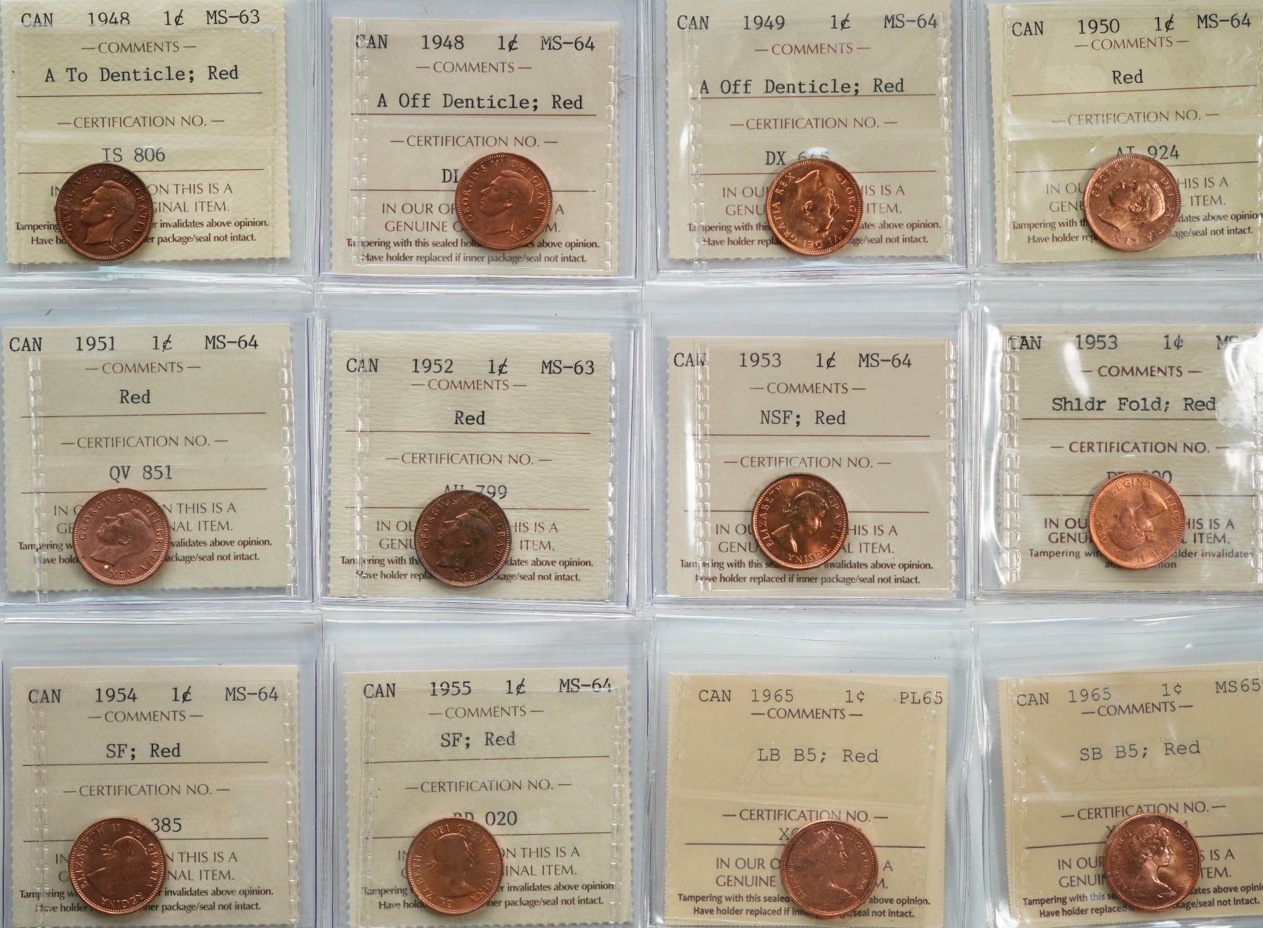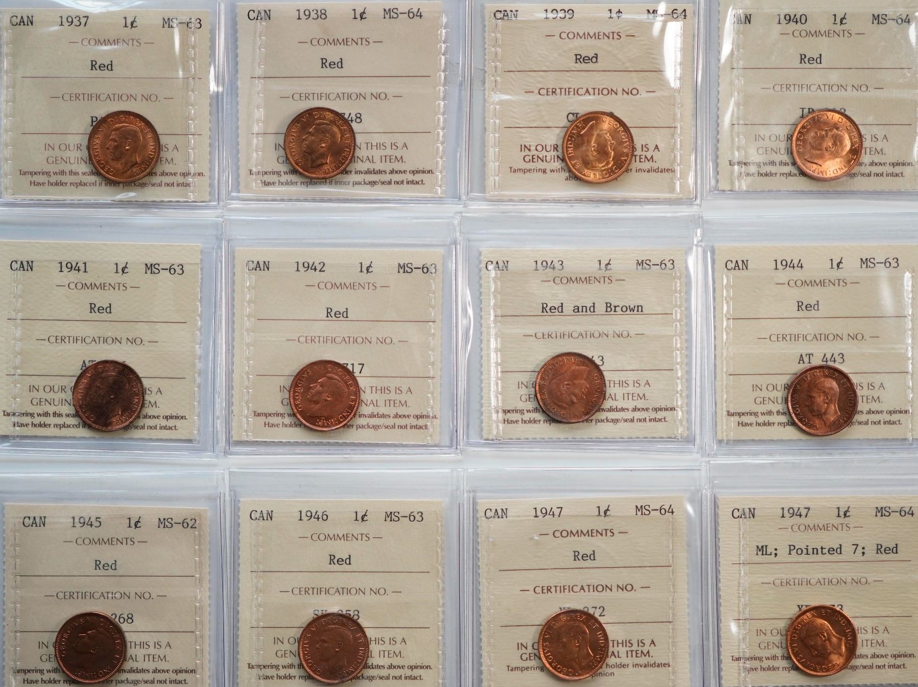 1937 1¢,1938 to 1955 included 1947, 1947 Ml, 1948 A to, A Off, 1953 SF, and 1965 LB B5, SB B5, all ICCS Choice Mint State-63 to Gem Mint State-65RED, lot of 24 coins.