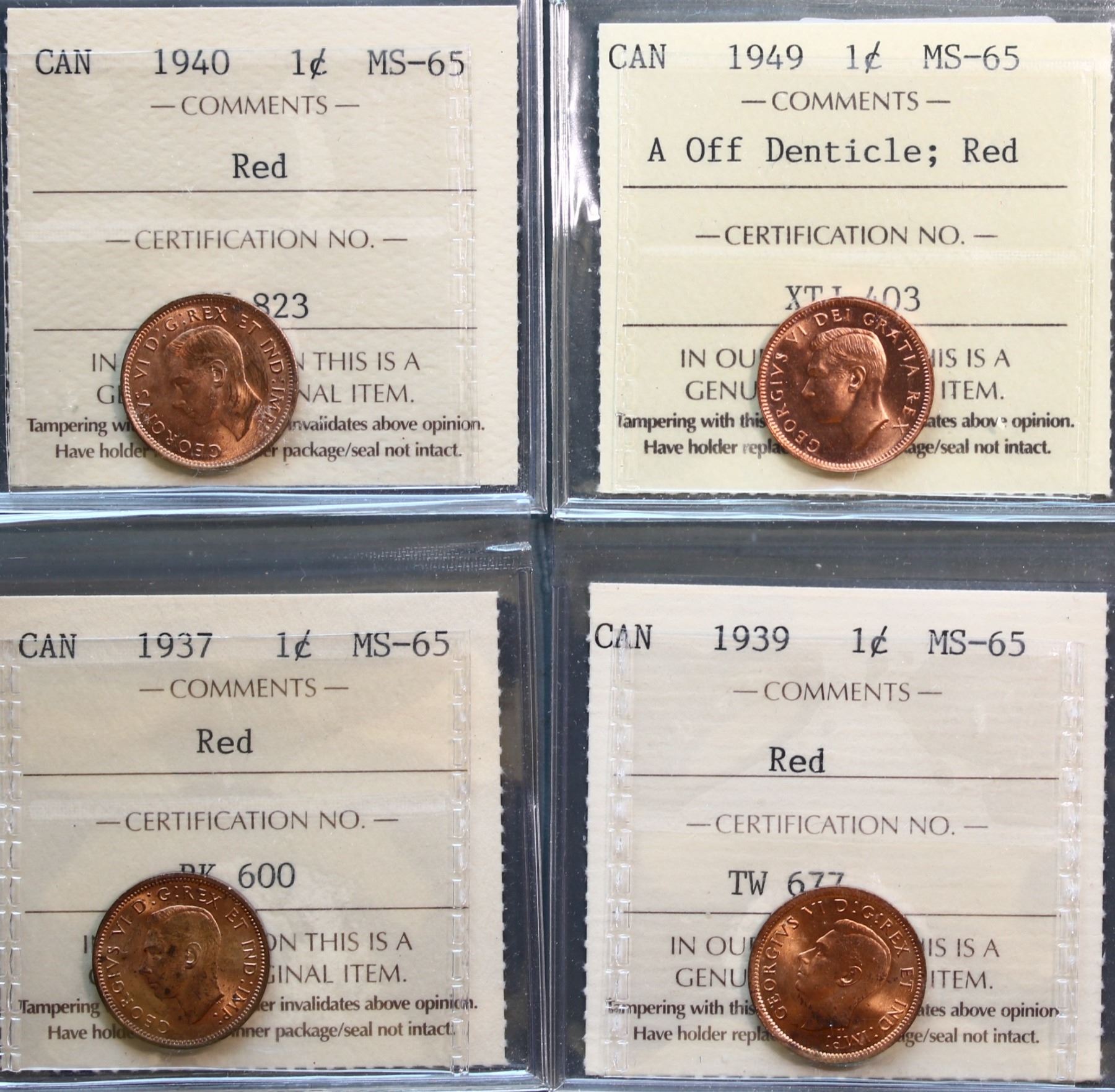 1937 1¢, 1939, 1940, and 1949 A Off Denticle, all ICCS Gem Mint State-65RED, lot of 4 coins.