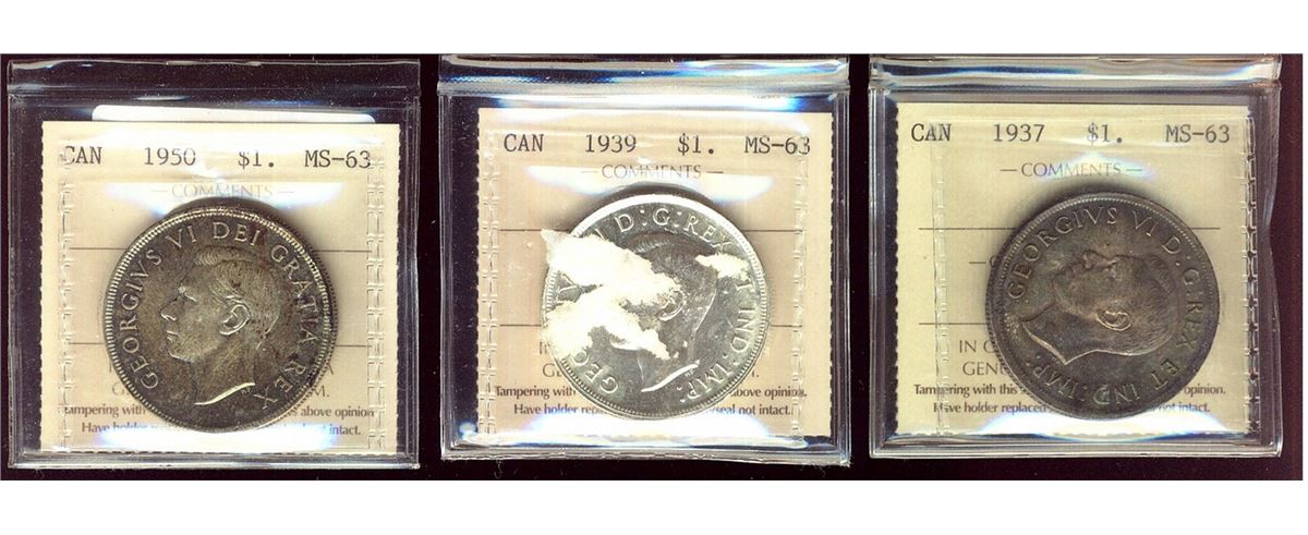 1937 $1, 1939 & 1950 ICCS MS63. Lot of 3 coins.