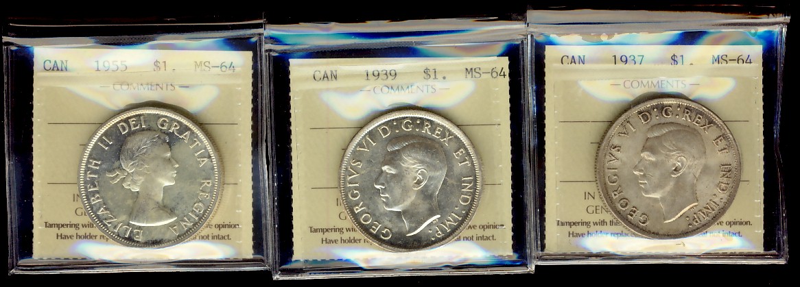 1937 $1, 1939 & 1955 ICCS MS64. Lot of 4 coins.
