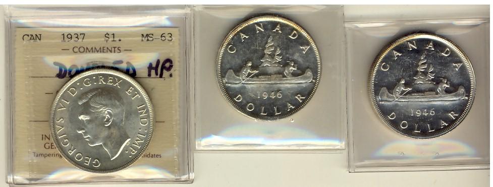 1937 $1 & 1946(2). Lot of 3 dollars MS60 to 63. 1937 is ICCS graded.