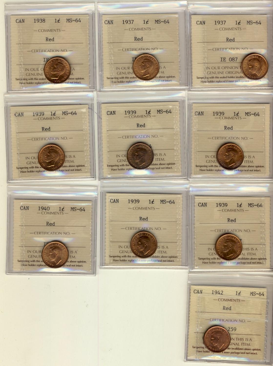 1937 1¢(2), 1938, 1939(5), 1940 & 1942 ICCS MS64RD. Lot of 10 coins all red.