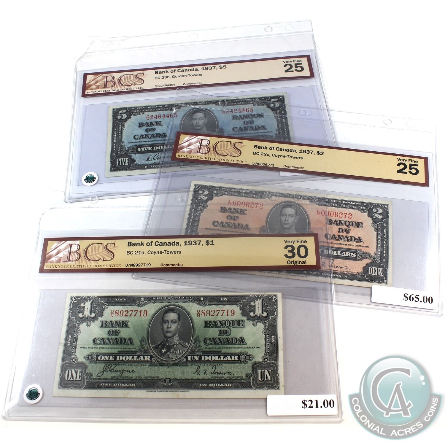 1937 $1, $2 & $5 Bank of Canada Notes BCS Certified. You will receive $1 BC-21d Coyne-Towers S/N: U/N8927719 BCS VF-30 Original, $2 BC-22c Coyne-Towers S/N: L/R0006272 BCS VF-25 & $5 BC-23b Gordon-Towers S/N: C/C2464465 BCS VF-25. 3pcs