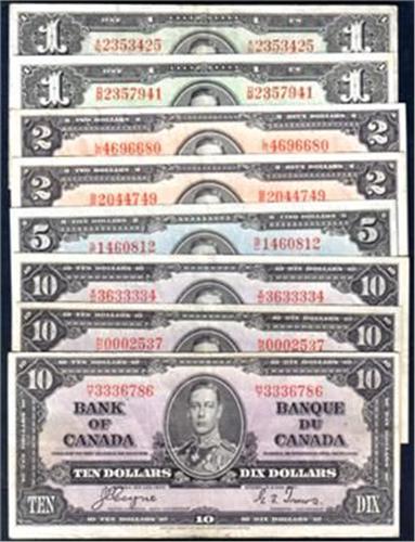 1937 One Dollar Gordon-Towers BC-21c and BC-21d. Plus Two Dollars Coyne-Towers, two notes BC-22c, Five Dollars Gordon-Towers BC-23b and Ten Dollars Gordon-Towers BC-24b and two notes Coyne-Towers BC-24c. Eight notes, Fine+ to EF, most VF and better