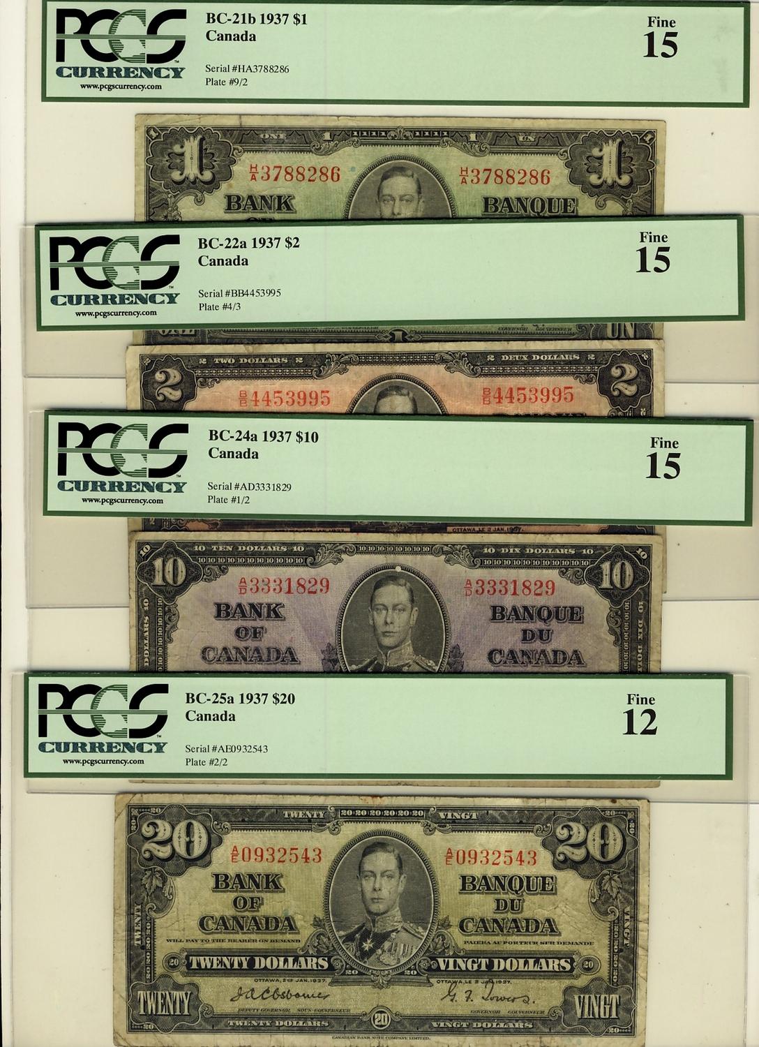 1937 $1 BC-21b H/A, $2 BC-22a, $10 BC-24a $20 BC-25a all PCGS F15 except $20 PCGS F12