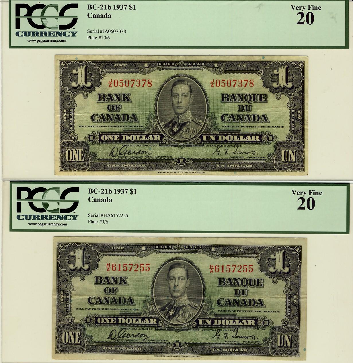 1937 $1 BC-21b H/A 6157255; J/A 0507378 both PCGS VF20