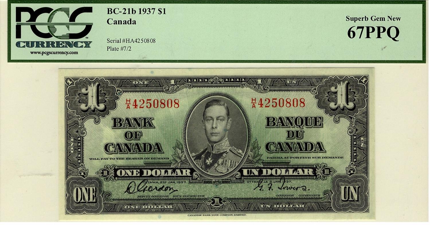 1937 $1 BC-21b #HA4250808, PCGS Superb Gem UNC67 PPQ. A perfect example. Very flashy. Possibly the finest graded.