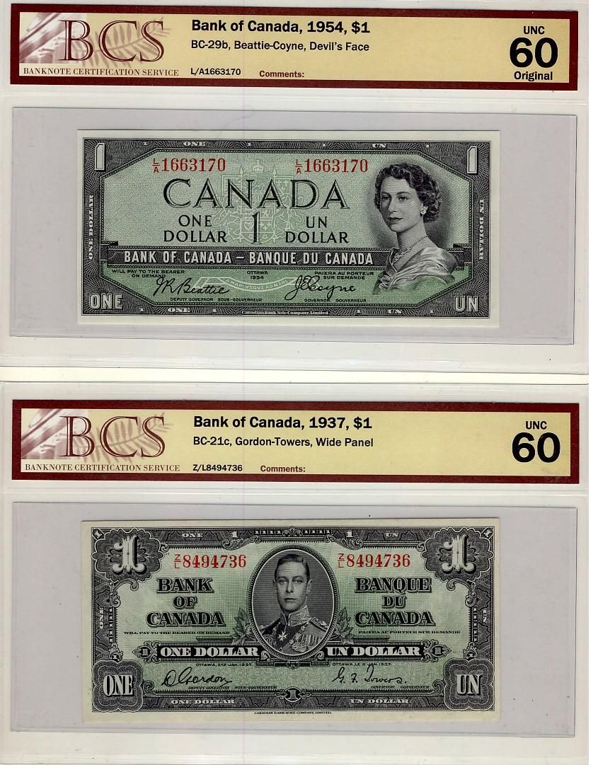 1937 $1 BC-21c & 1954 $1 DF BC-29b. Lot of 2 notes both BCS UNC60.