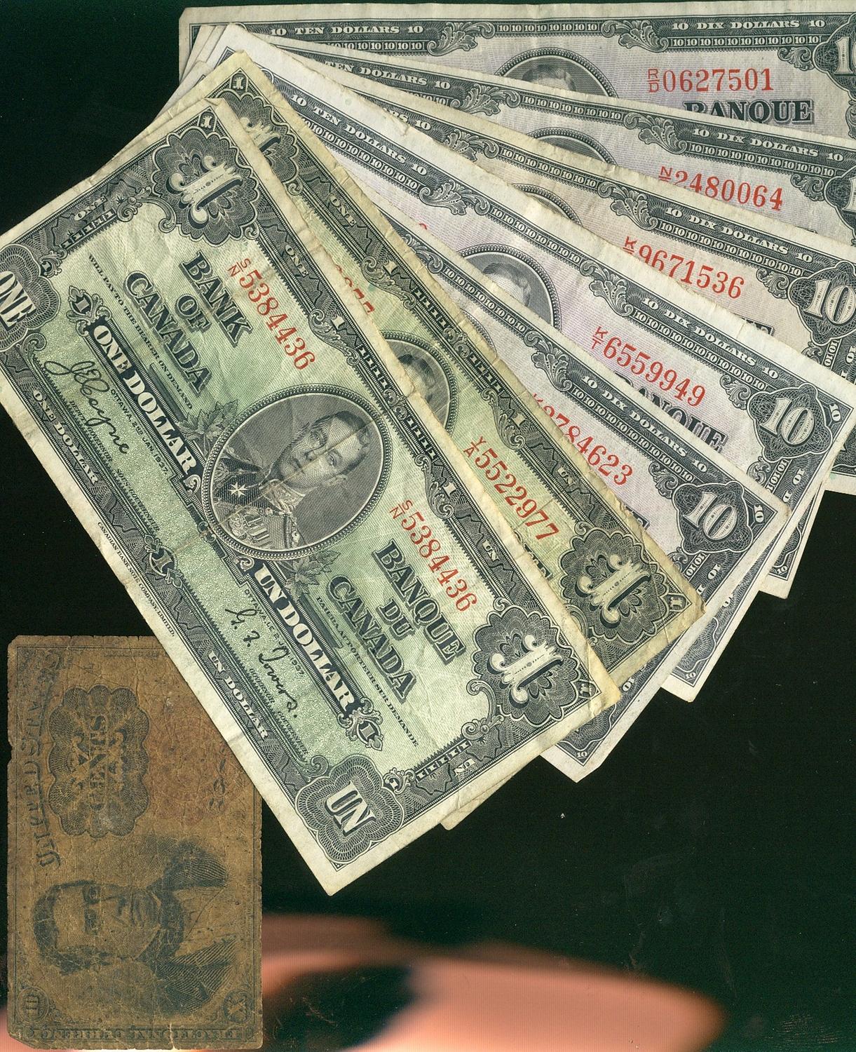 1937 $1 BC-21c, 21d, $10 BC-24b(2) & BC-24c(4) along with US 10¢ Fractional note. Lot of 9 notes all VG to VF.