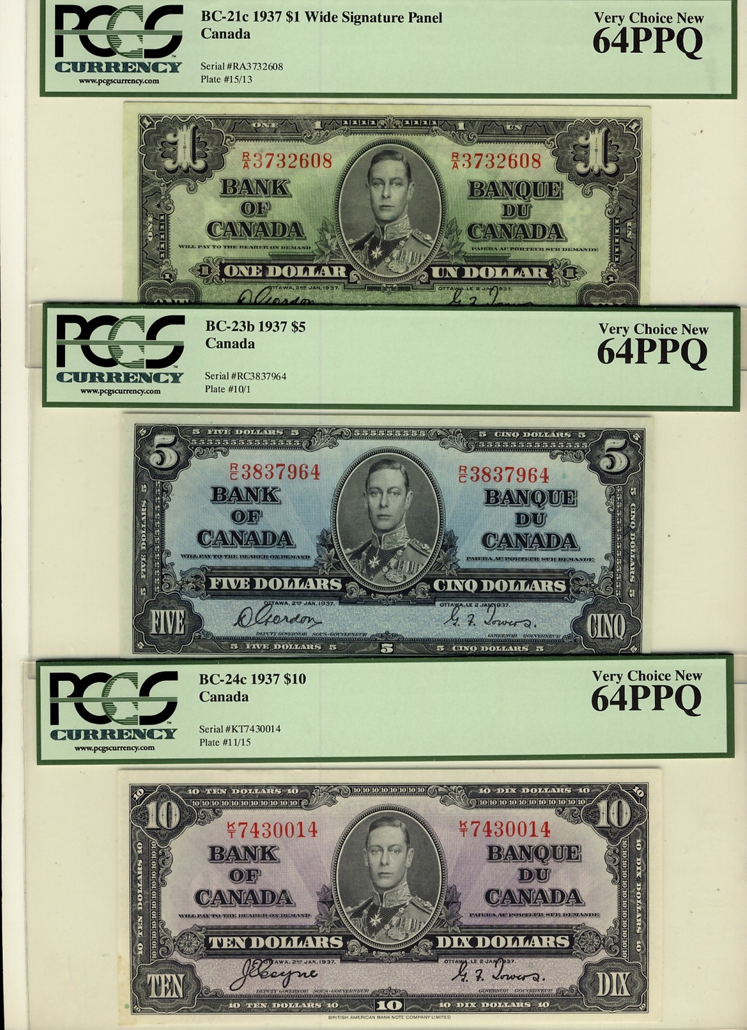 1937 $1 BC-21c, $5 BC-23b, $10 BC-24c, all PCGS UNC64PPQ