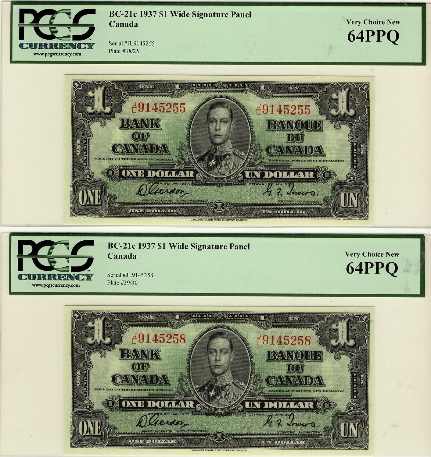 1937 $1 BC-21c #9145255 & 258 PCGS UNC 64PPQ. Lot of 2 notes.