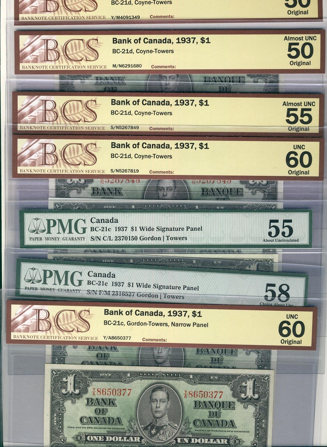 1937 $1 BC-21d BCS BCS AU50(2), AU55, & UNC60, BC-21c AU55 & AU58 PMG and BCS UNC60. Lot of 7 notes