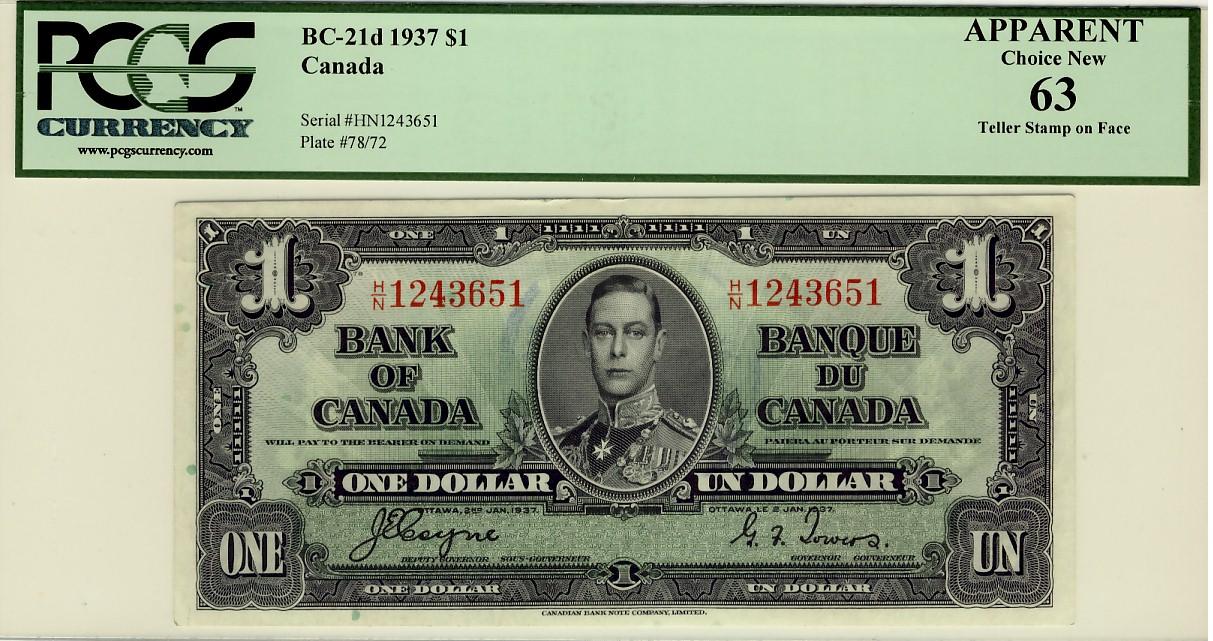 1937 $1 BC-21d #H/N1243651 PCGS Apparent UNC63 Teller Stamp on Face