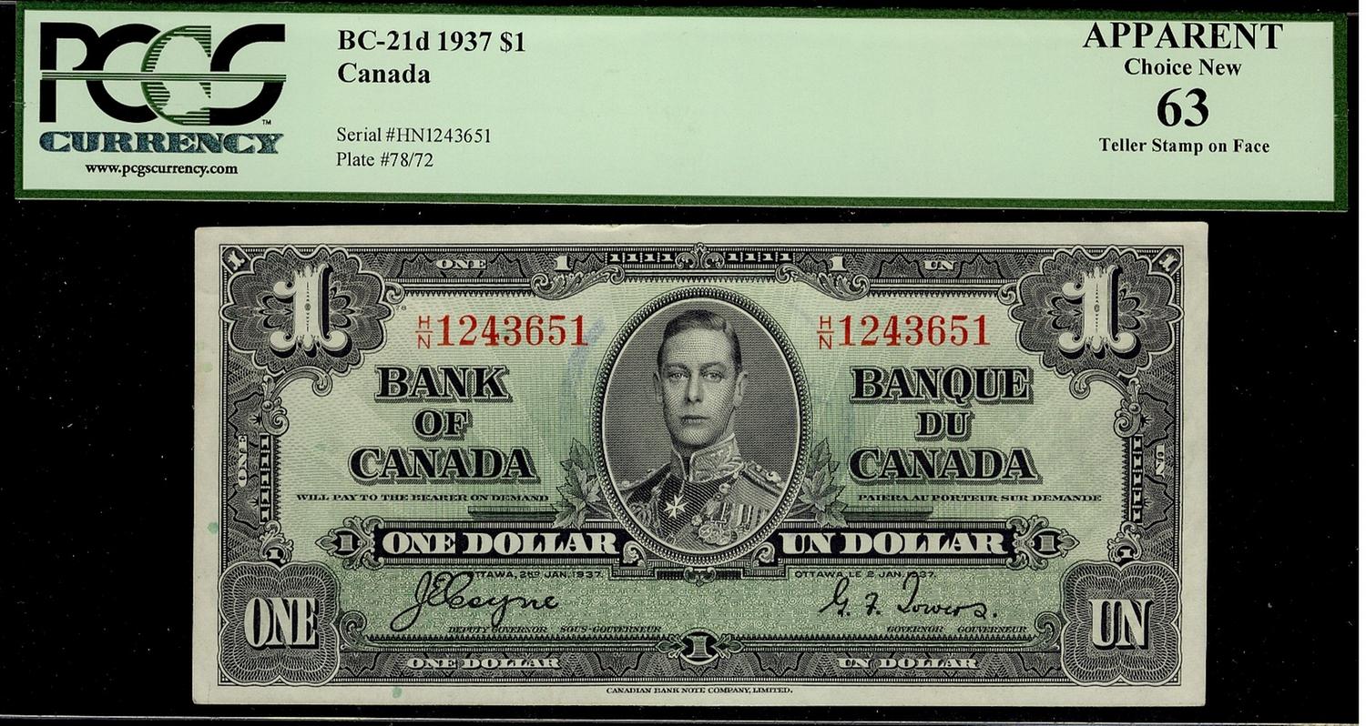 1937 $1 BC-21d #H/N1243651 PCGS Apparent UNC63 Teller Stamp on Face
