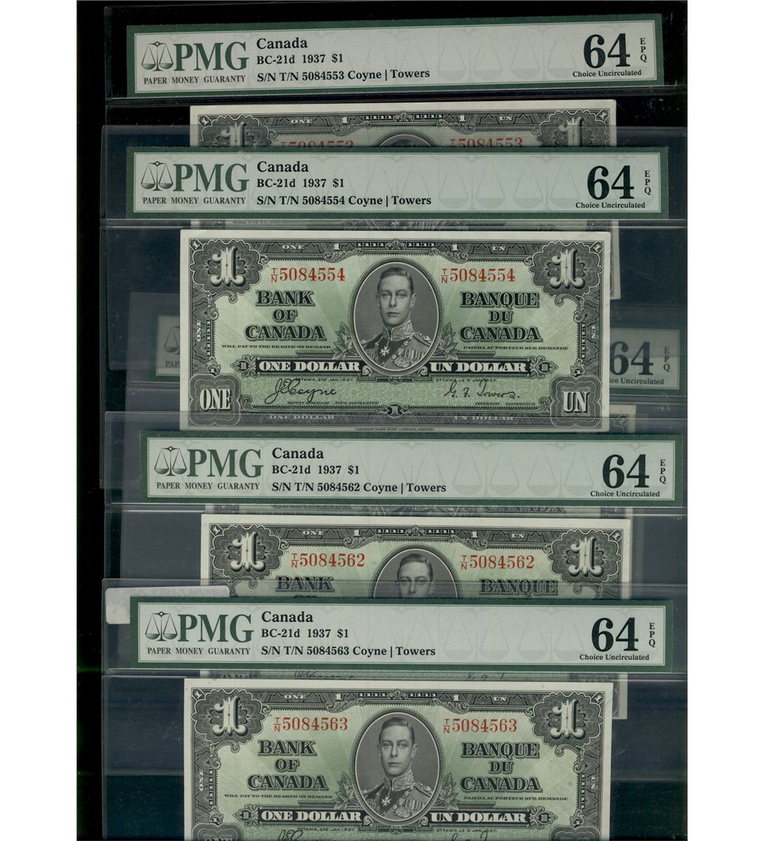 1937 $1 BC-21d T/N5084553 to 563. Lot of 11 consecutive notes, all PMG UNC64EPQ