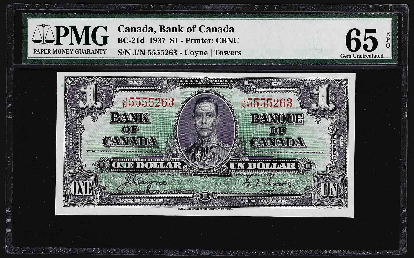One 1937 $1 Bank of Canada Note PMG Gem Uncirculated 65EPQ. PMG Certified.