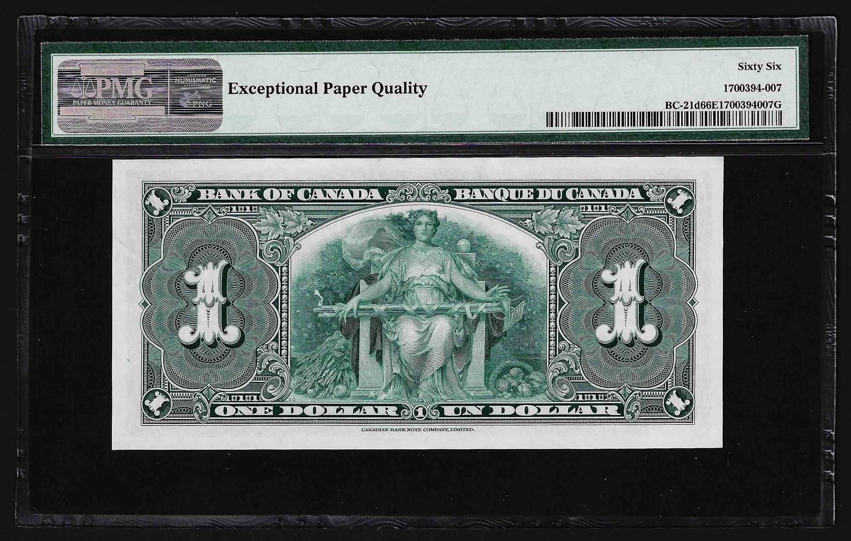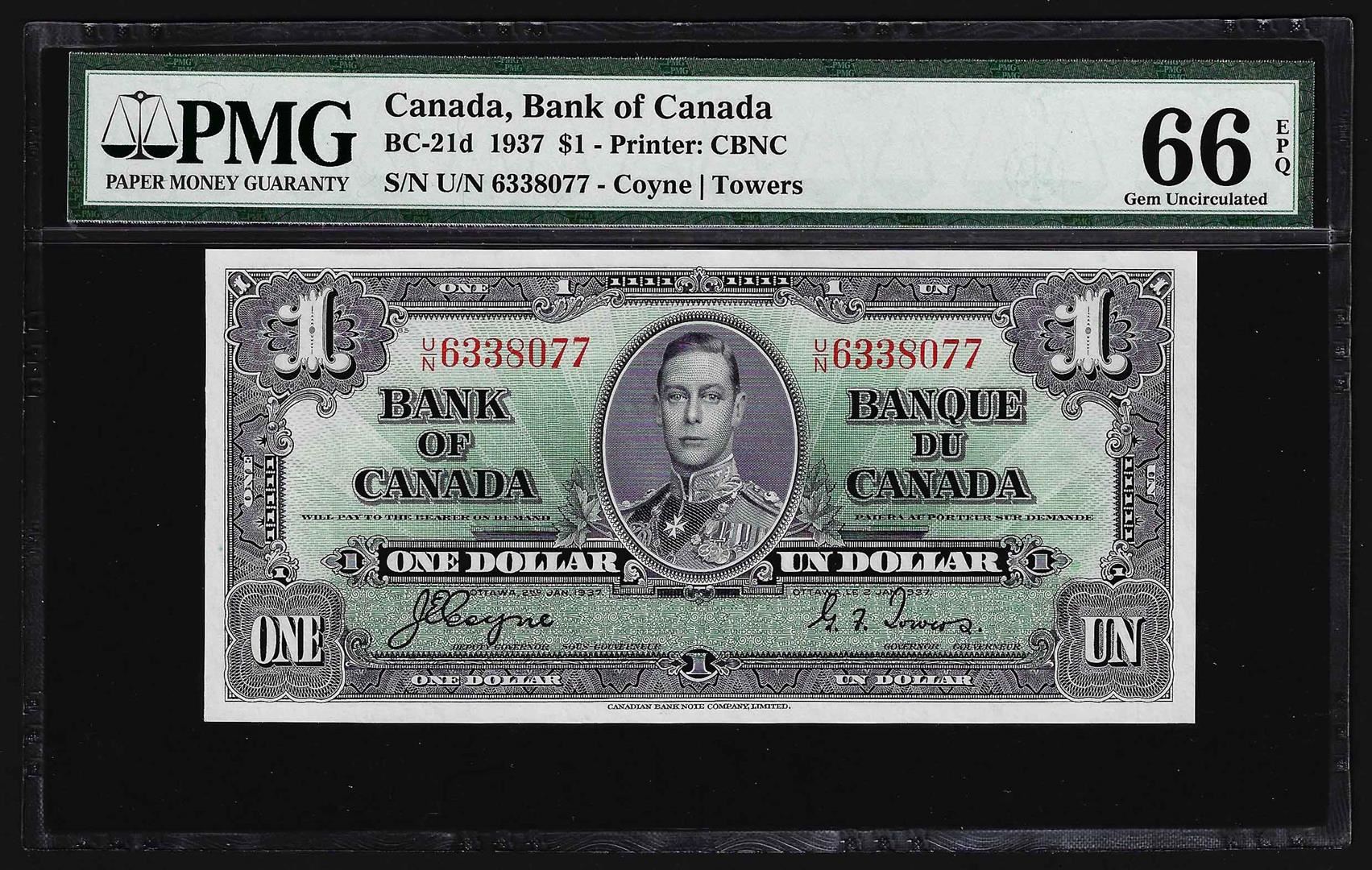 One 1937 $1 Bank of Canada Note PMG Gem Uncirculated 66EPQ. PMG Certified.