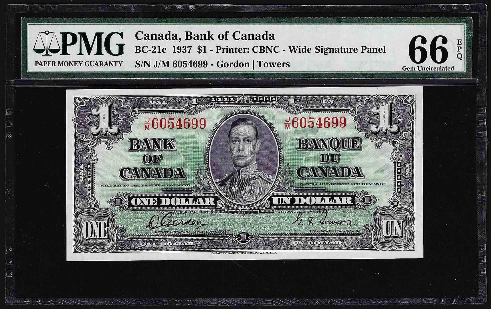 One 1937 $1 Bank of Canada Note PMG Gem Uncirculated 66EPQ. PMG Certified.
