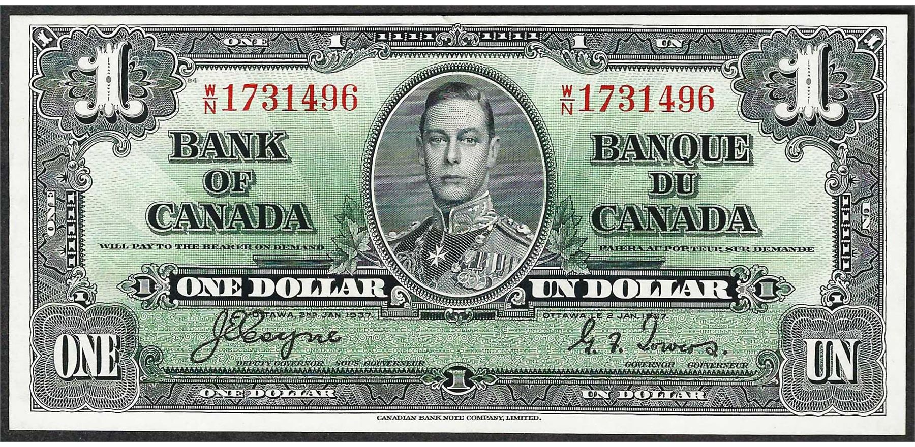 One 1937 $1 Bank of Canada Note.