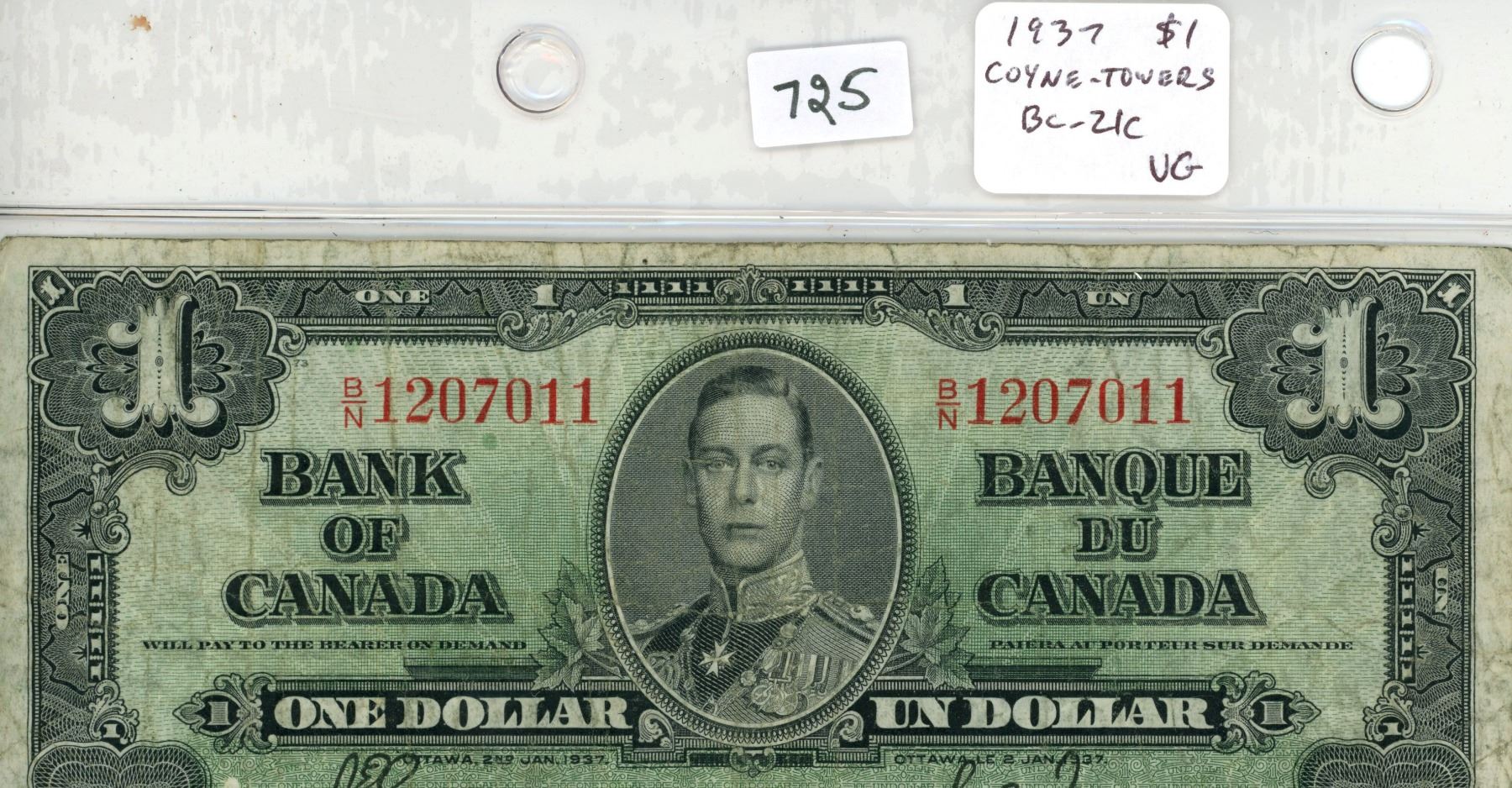 1937 $1. Coyne-Towers signatures. B/N Prefix. BC-21c. VG-8.