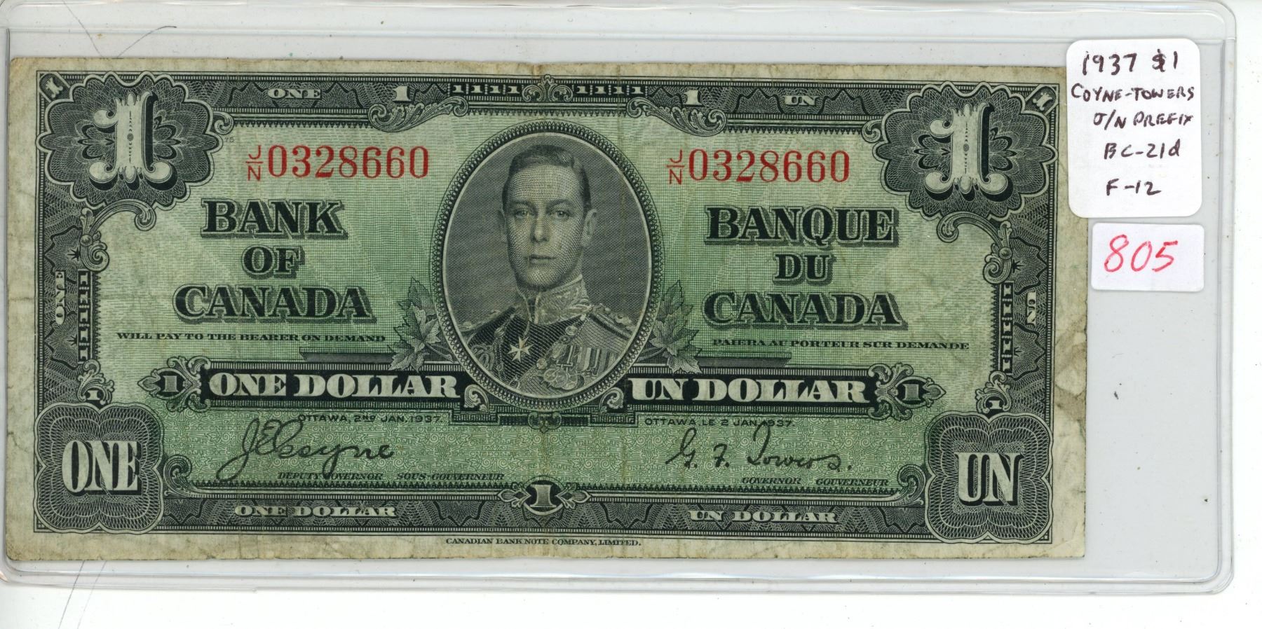 1937 $1. Coyne-Towers signatures. J/N Prefix. BC-21d. F-12.