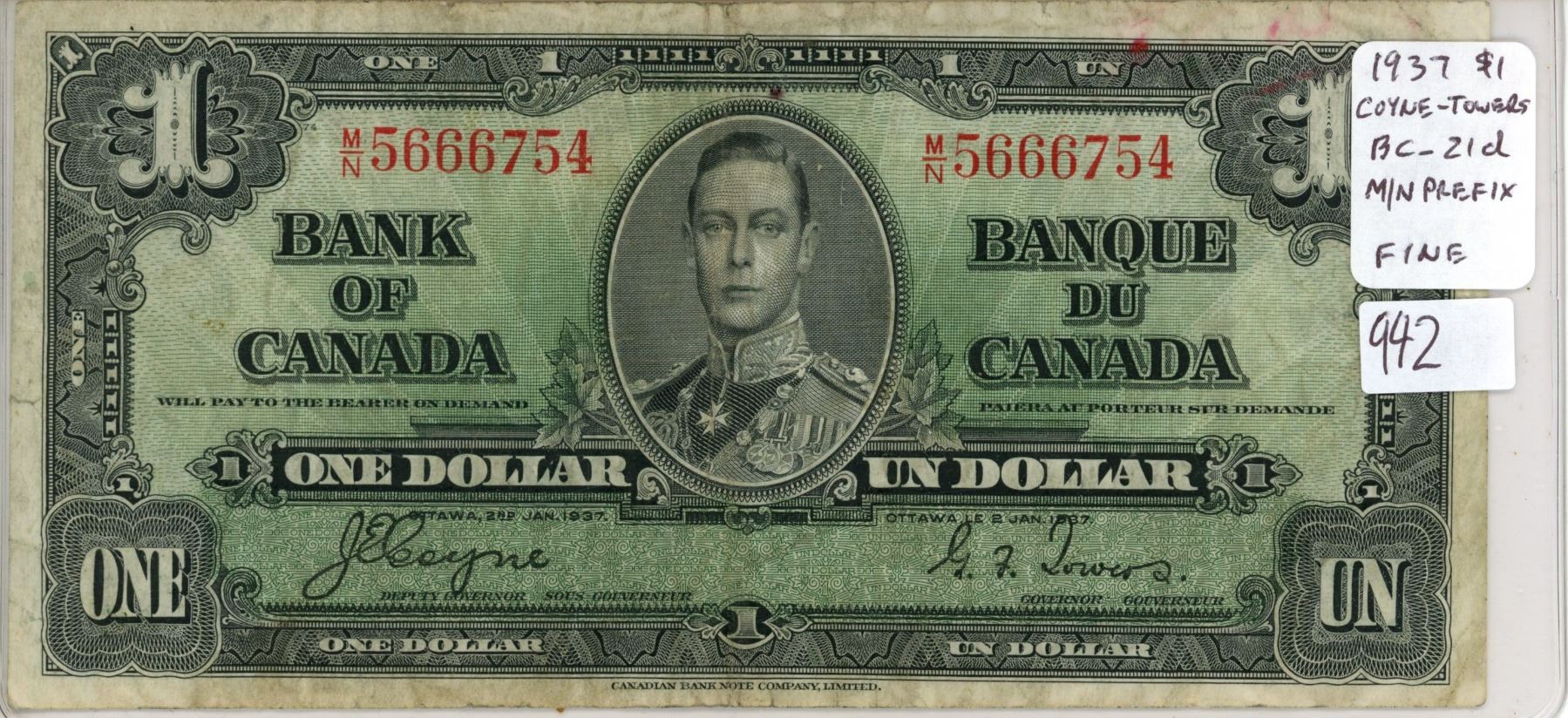 1937 $1. Coyne-Towers signatures. M/N Prefix. BC-21d. Fine-12.
