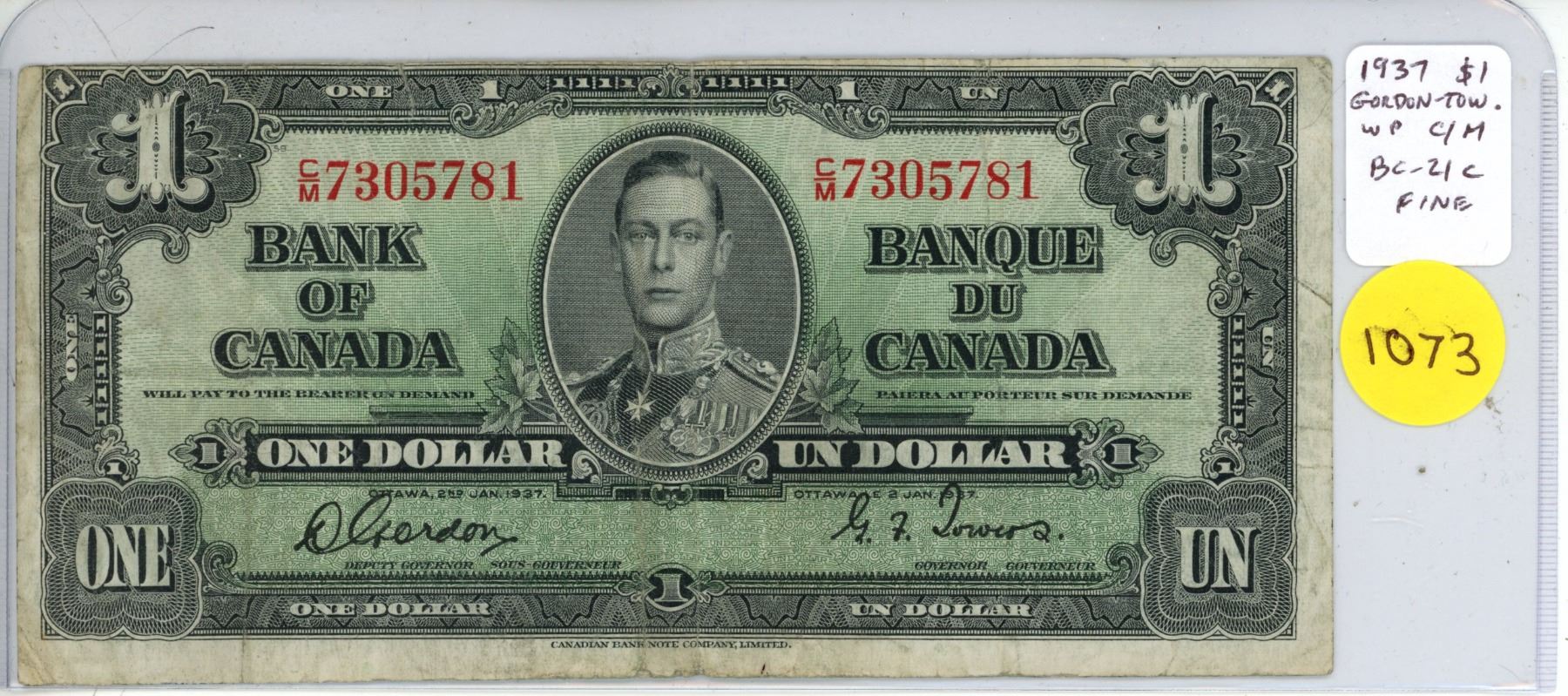 1937 $1. Gordon-Towers signatures. Wide Signature Panel. C/M Prefix. BC-21c. Fine-12.