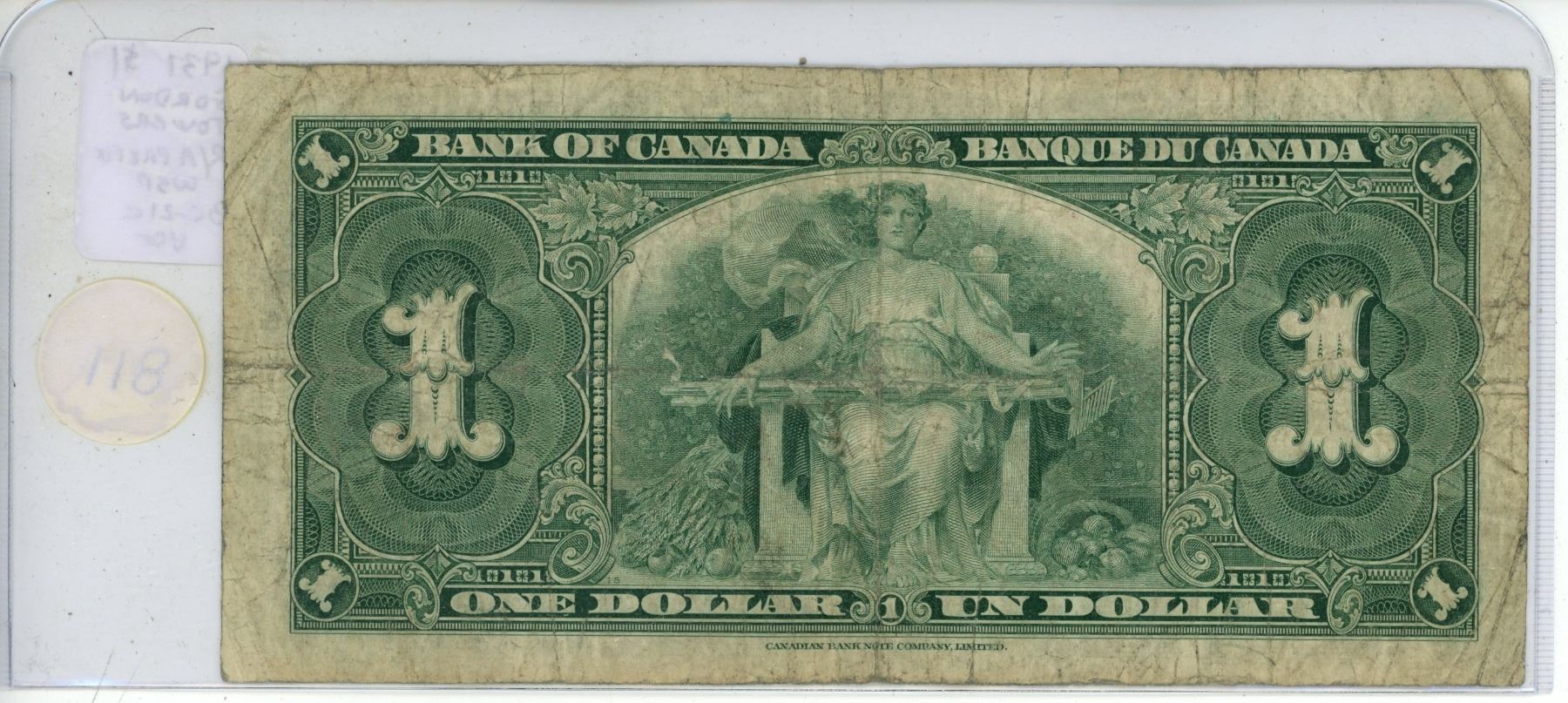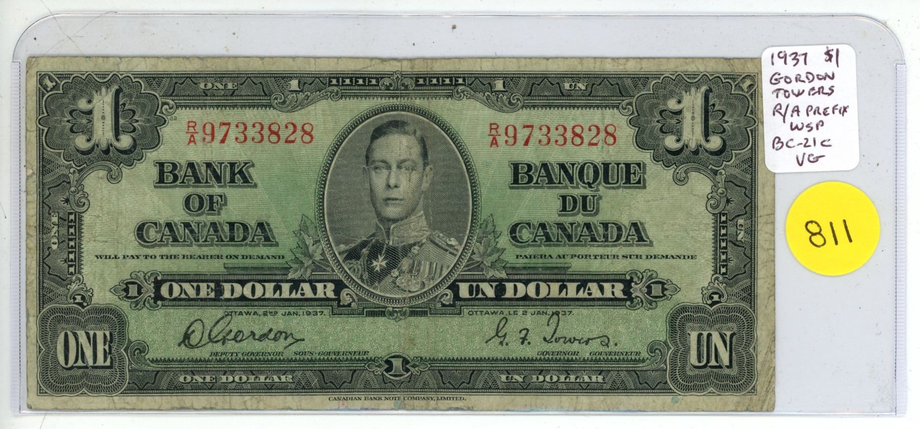 1937 $1. Gordon-Towers signatures. Wide Signature Panel. R/A Prefix. BC-21c. VG-8.