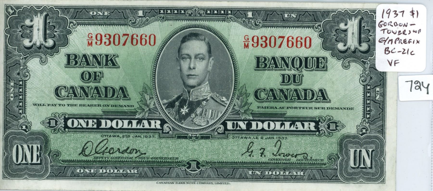 1937 $1. Gordon-Towers signatures. Wide signature panel. G/M Prefix BC-21c. VF-20.