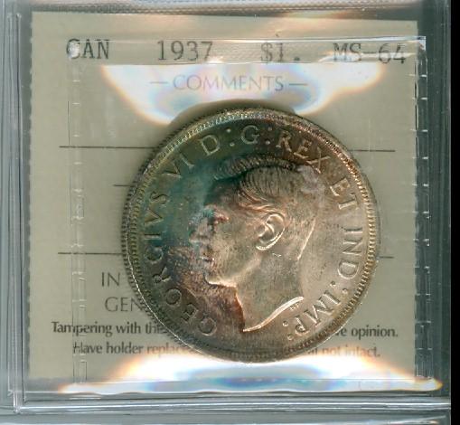1937 $1 ICCS MS64. Flashy with partial bluish gold tone.