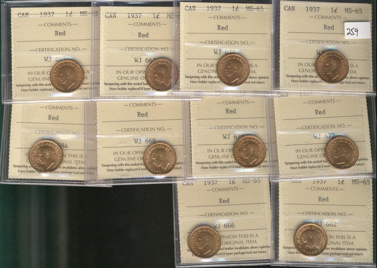 1937 1¢ ICCS MS65RD. Lot of 10 coins all full red.