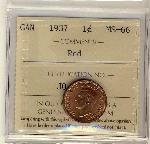 1937 1¢ ICCS MS66 Full Red, A superb GEM example.