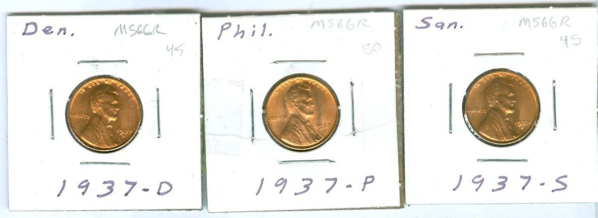 1937 1¢. Lot of 3 coins includes S, P & D Mint marks. MS65Rd or better.