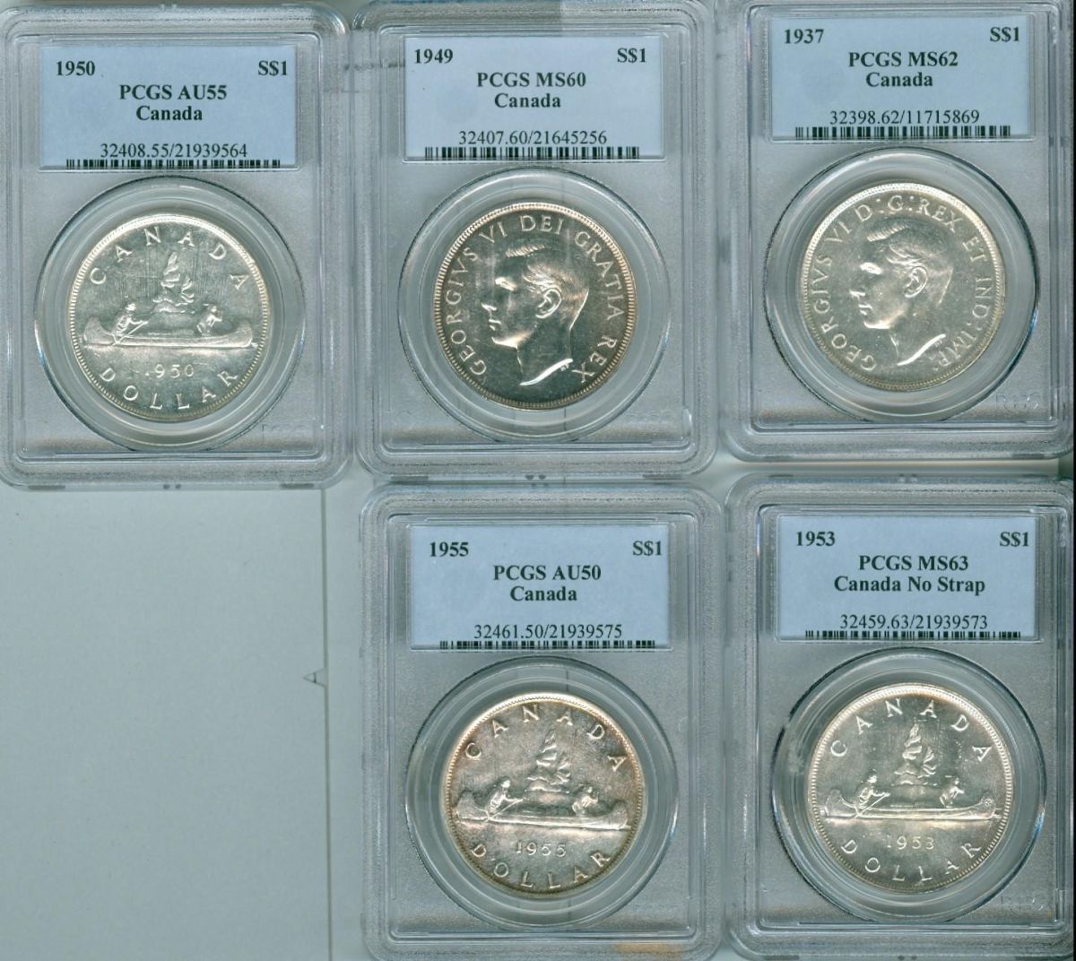 1937 $1 MS62, 1949 MS60, 1950 AU55, 1953 NSF MS63 & 1955 AU50. Lot of 5 PCGS graded coins. All nice examples.