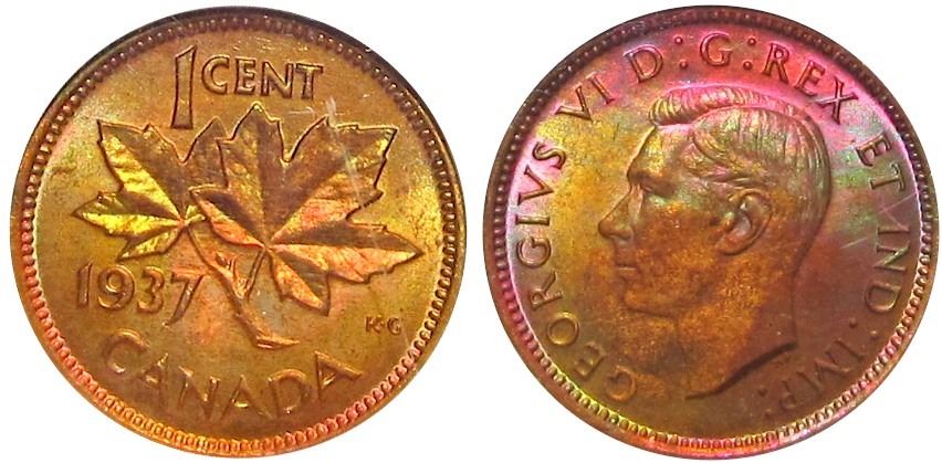 1937 1¢ NGC Superb Gem Mint State-66RB. Superb gem tones of gold and greens.