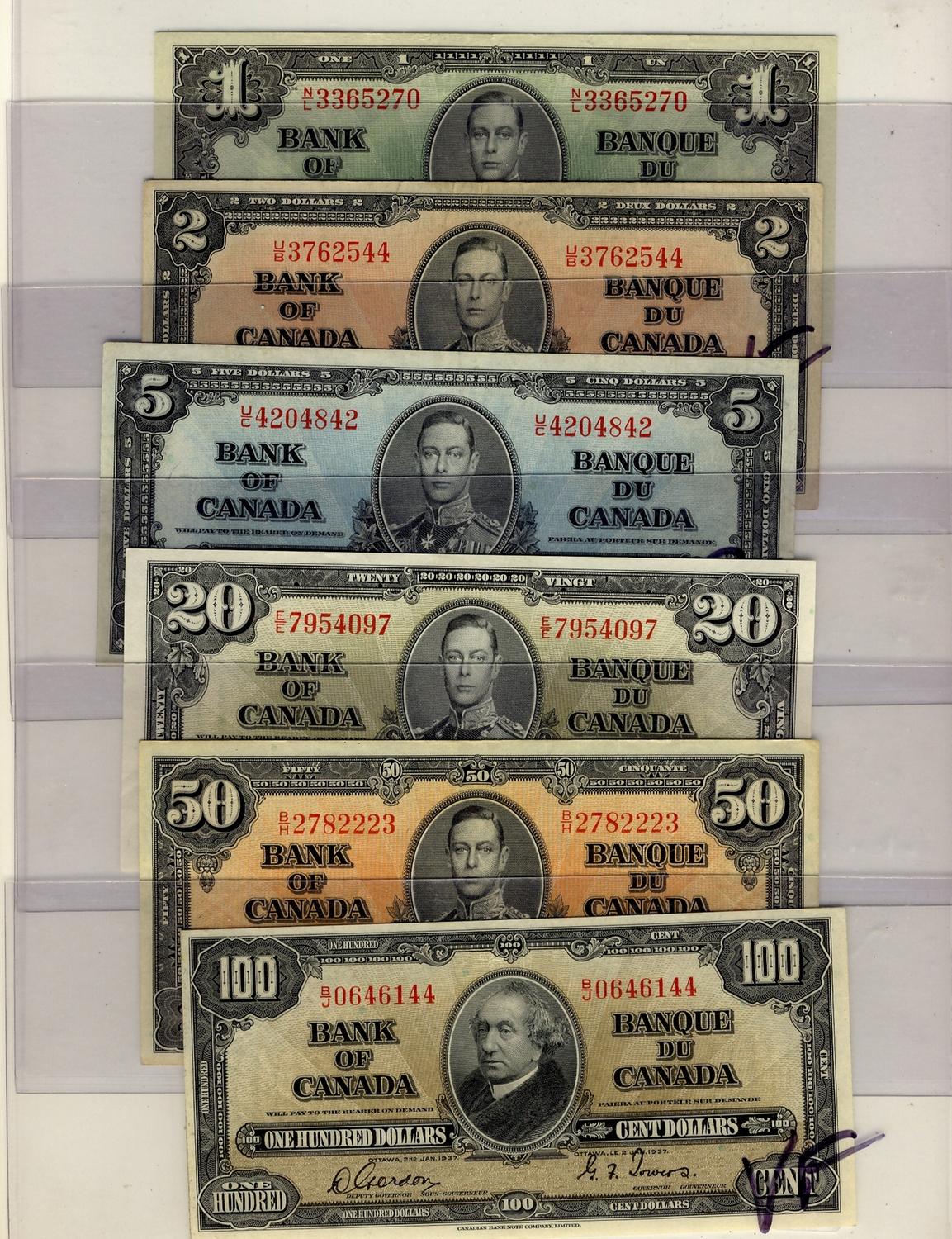 1937 $1 to $100. Lot of 6 notes includes, $1 BC-21c, $2 BC-22b, $5 BC-23b, $20 BC-25b, $50 BC-26b & $100 BC-27b. VF to EF.