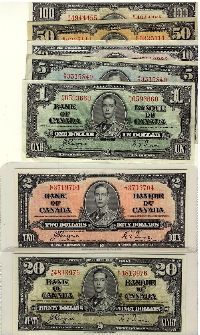 1937 $1 to $100. Lot of 7 pcs includes. BC-21d, BC-22c, BC-23c, BC-24c, BC-25c, BC-26b & BC-BC-27c. Notes grade Fine to AU.