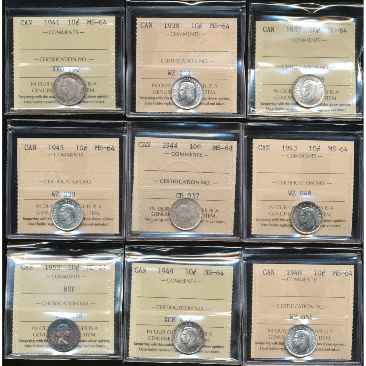 1937 10¢, 1938, 1941, 1943, 1944, 1945, 1946, 1949 & 1953 NSF all ICCS MS64. Lot of 9 coins.
